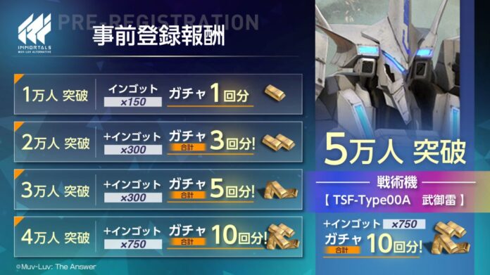 El pre-Registro para Immortals: Muv-Luv Alternative ya puede realizarse siguiendo el Twitter oficial, con el cual podrán obtener a Yoroi Mikoto (SR) a mandera de regalo que se repartirán como recompensas adicionales según los números de preinscripción.