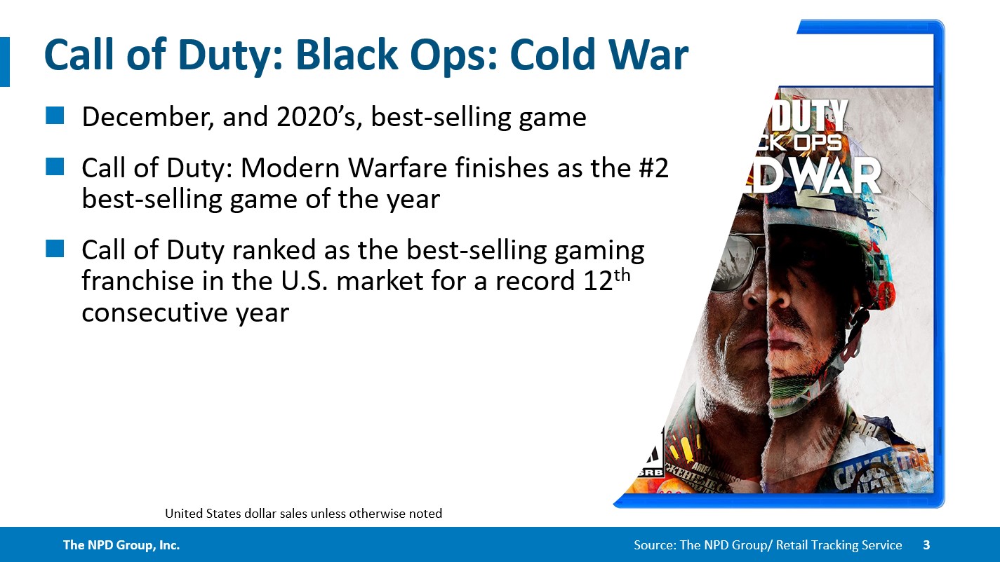 El juego mรกs vendido del mes, y de 2020 en su conjunto, fue el tirador militar de Activisionย Call of Duty: Black Ops Cold War,ย con el segundo lugarย tambiรฉnย perteneciente aย Call of Dutyย con la versiรณn 2019 deย Modern Warfare.