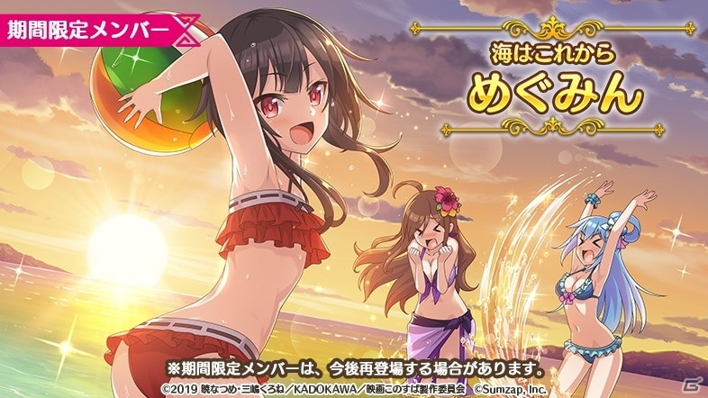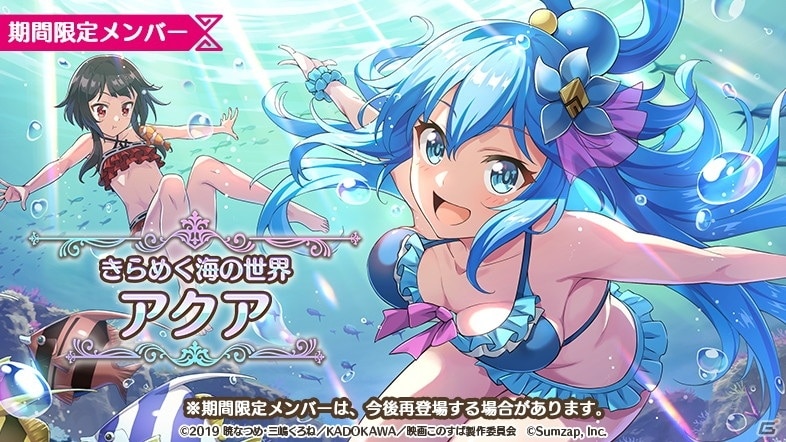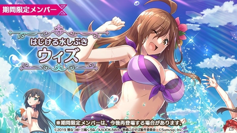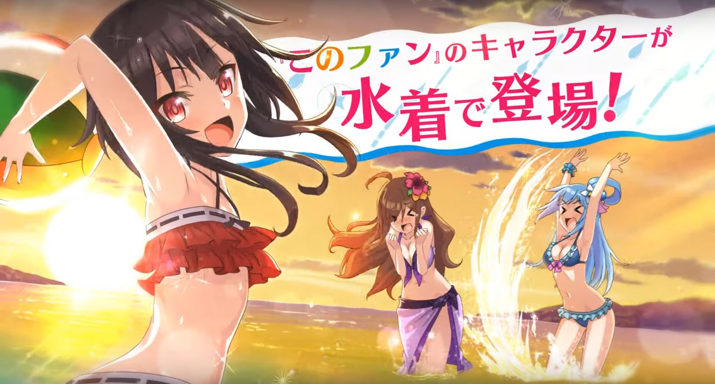 También hay un gacha temático titulado Doki Doki! Mizugi y permite obtener a Aqua, Wiz y Megumin luciendo encantadores trajes de baño.