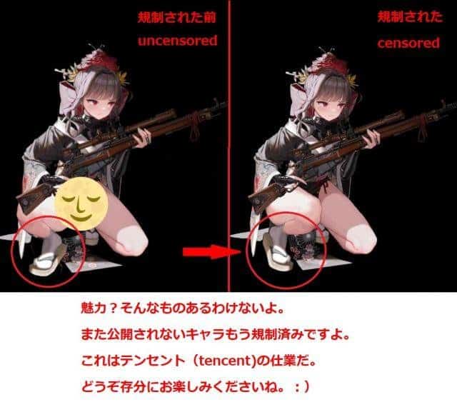 Nikke Goddess of Victory, un título venerado por su apreciación de los diseños femeninos sexys, se supo que había sido censurado después de todo, ya que los diseños de algunos de los personajes femeninos y sus trajes fueron alterados originalmente para ser menos reveladores, y muchos sospechan que esto se debe a que la propiedad del juego pasó a manos de Tencent.