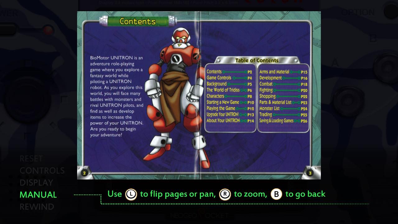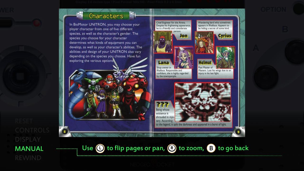 Algo muy importante del juego original, era el uso del manual físico, pues ahí se explicaban muchas cosas que nunca se mencionan o se explican de manera detallada dentro del juego. Ahora con la llegada de Biomotor Unitron a las tiendas digitales, SNK incluyó una representación digital del antiguo manual físico, para así evitar que los usuarios se perdieran de información importante.