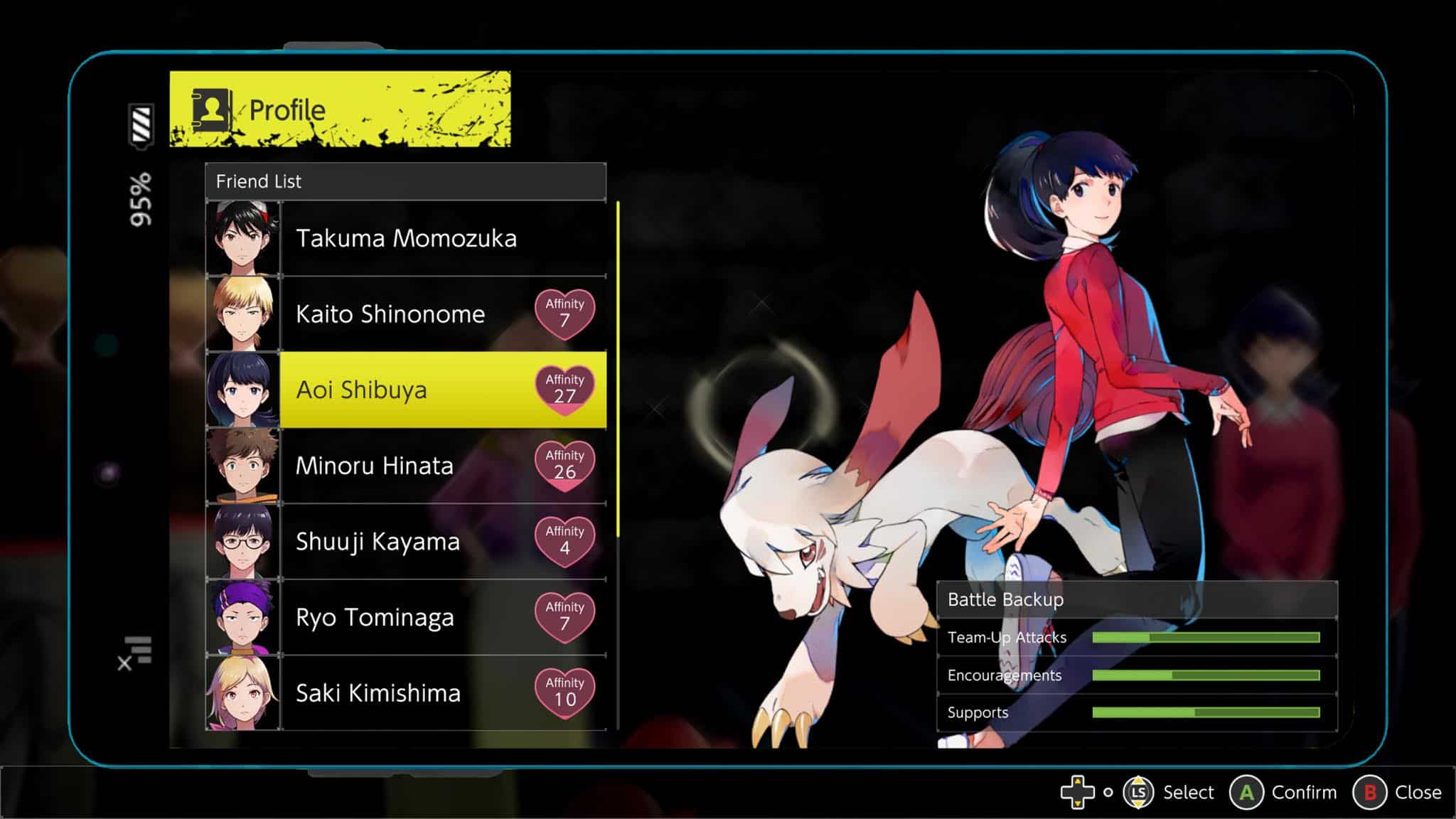 También cabe mencionar que los personajes humanos nos sirven como soporte en una batalla. Dentro de las opciones de combate tenemos una opción para hablar con otro miembro del grupo, si realizamos esta acción, se nos otorgan diferentes tipos de ventajas pasivas. Lo interesante de esto, es que este sistema mejora gracias a las afinidades que vamos subiendo durante las secciones de historia, por lo que logran darte una buena sensación de progresión y cohesión entre la parte de novela visual con la parte de rpg.
