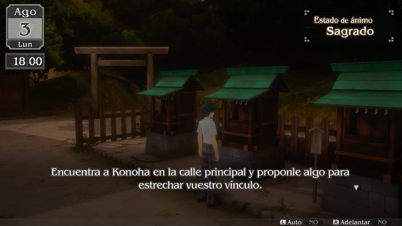 Ahora vamos a pasar al aspecto más divisivo del título. En Loop8: Summer of Gods estamos en un bucle temporal de 5 días. Si no activamos el evento que nos permite continuar, ocurrirá el fin del mundo y volveremos al primer día del juego. No perderemos el progreso de afinidad con los habitantes, pero sí estaremos expuestos a una sensación de repetición, a veces incluso será mejor forzar ese bucle (hablando con un personaje en concreto) si realmente no sabemos qué hacer para continuar.