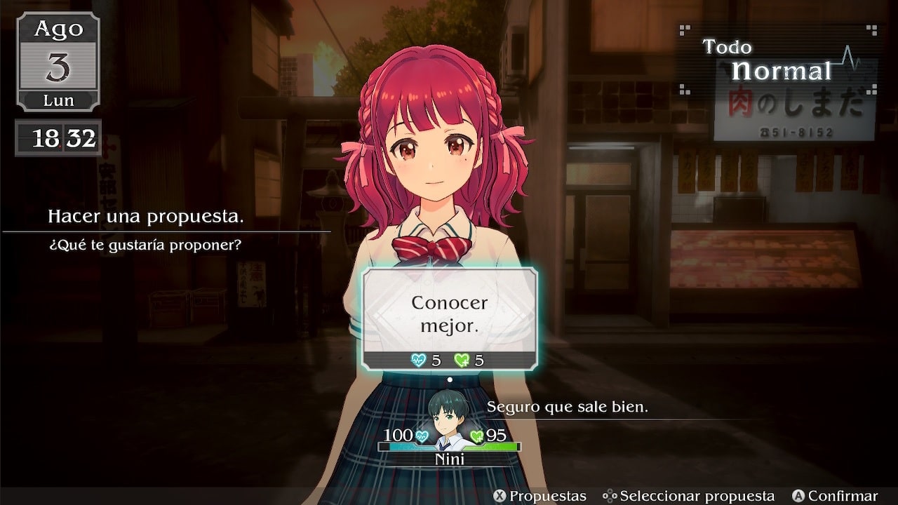 Interactuar con los otros personajes nos consumirá puntos de energía, de vitalidad o de ambas, además de tiempo del día. Dormir nos ayudará a recuperar energías, pero tendremos que administrar nuestro tiempo para socializar, comer en algún bar o hacer actividades que suban nuestros atributos, todo en 5 días del juego, constantemente. También podremos recuperar energías hablando con cierto NPC que preferimos no desvelar.