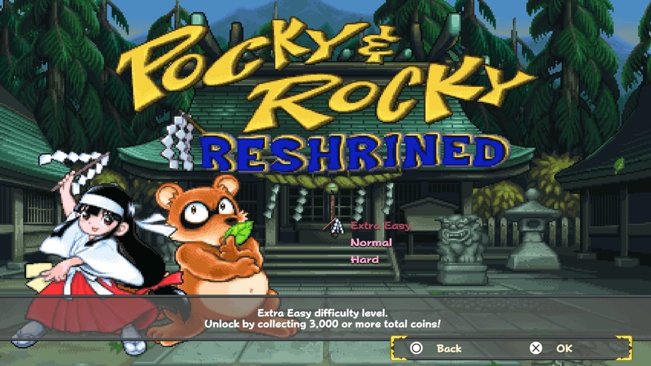 En Pocky & Rocky Reshrined contamos con varios modos de juego que pueden alargar la Re-jugabilidad del mismo, Obviamente empezaremos directamente con el modo historia que se divide en 3 dificultades, estando disponibles desde el principio la dificultad “Normal” y la “Difícil” hay una dificultad extra que es la “Fácil” pero para desbloquearla primero tendremos que sufrir un rato ya que esta dificultad solo se puede desbloquear luego de conseguir 3.000 monedas en el juego.