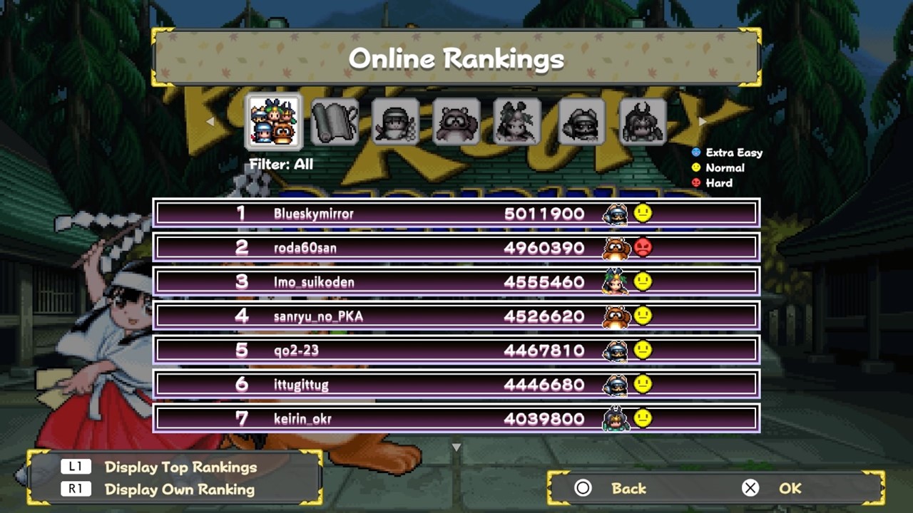 El juego cuenta con un sistema de Ranking online que queda registrado cada vez que gastamos todas nuestras vidas en una partida, aquí podremos ver la mejor puntuación que se ha conseguido en cualquiera de las dificultades del juego y con qué personaje se consiguió esta puntuación, cabe aclarar que nosotros mismos podemos elegir si queremos subir esta puntuación a los rankings o si no queremos hacerlo.