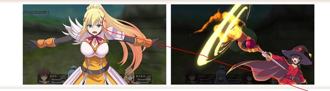 Kazuma, Aqua, Megumin, Darkness y un personaje mรกs desconocido formaran una party para emprender un viaje en busca de los secretos de la piedra demonรญaca. Los jugadores pueden modificar su party para completar misiones de clanes fuera de la historia principal Algunas misiones tienen requisitos especรญficos para ser completadas.