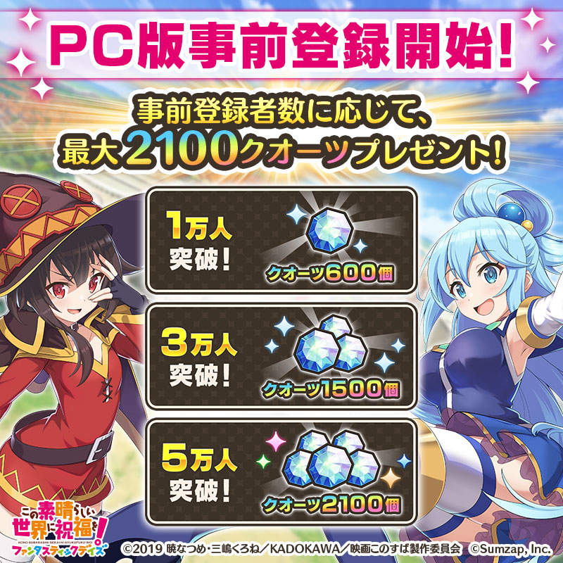 La cuenta oficial de Twitter para el videojuego para Smartphones Konosuba!: Fantastic Days anuncio hace unas horas que el juego estará disponible para PC en Japón.