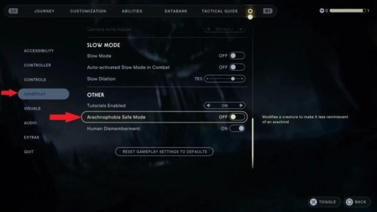 Así es, si entras al menú de ajustes cuando el juego está pausado, vas a la sección de «Gameplay» y bajas hasta la parte que dice «Otros» podrás activar y desactivar esta opción según lo veas necesario. Cabe destacar que muchos sitios de noticias han reportado que el modo elimina por completo a todos los enemigos con forma de araña, pero en las imágenes podemos ver que el juego dice que en realidad «Modifica a las criaturas para que se parezcan menos a un arácnido» así que es más probable que esto solo los reemplace con otro tipo de enemigo diferente.