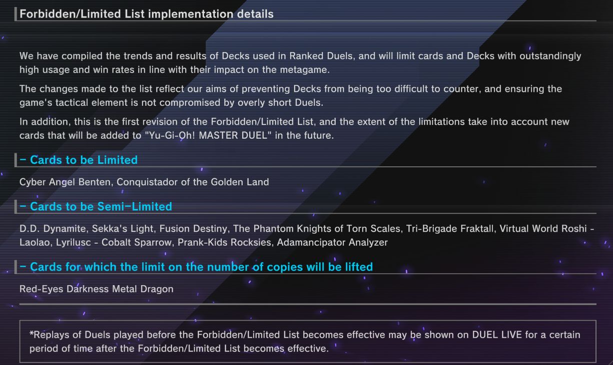 “Esta es la primera versión de la Lista Prohibida/Limitada, y el alcance de las limitaciones tiene en cuenta las nuevas cartas que se agregarán a YuGiOh Master Duel en el futuro”, dice Konami.