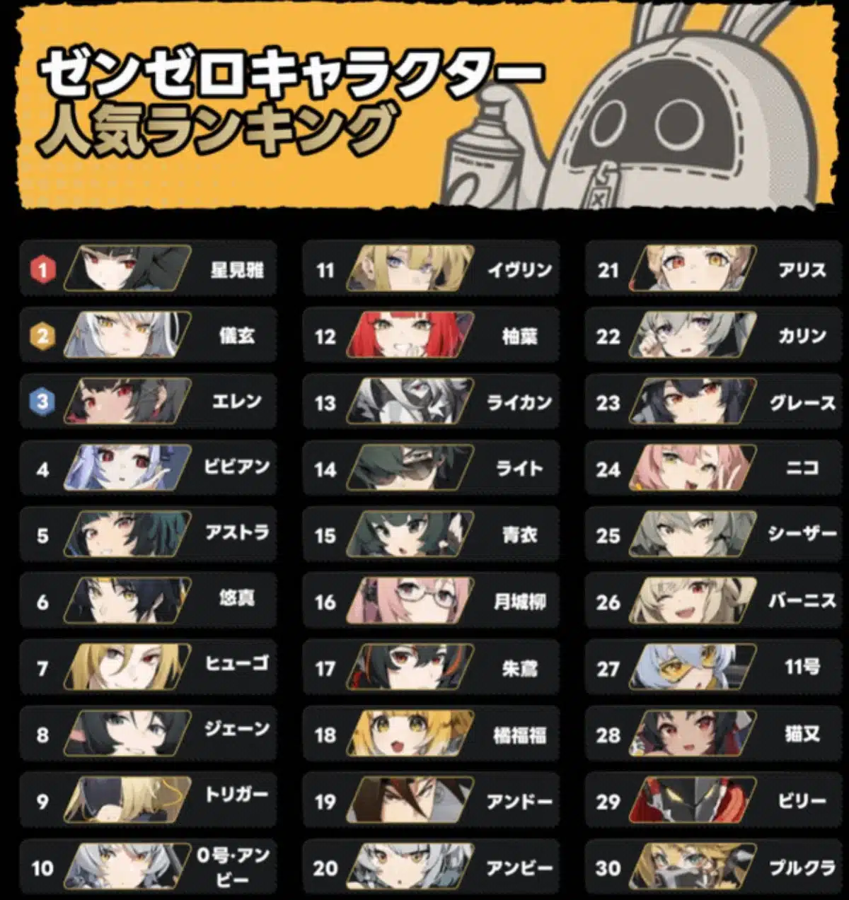 La chica se colocó como el personaje más popular de todos dentro del mundo de Zenless Zone Zero, algo que no sorprende porque es también de las más queridas en esta parte del mundo. Por su parte, la sigue Yixuan, un personaje reciente, pero que ya se adentró en el corazón de los fanáticos. El top 3 lo cierra Ellen Joe, uno de los primeros personajes promocionales que se añadió al juego y que sigue estando muy presente en la comunidad. Entre algunos de los otros nombres importantes tenemos a Jane Doe en el puesto 8 o Burnice que cayó hasta el número 26.