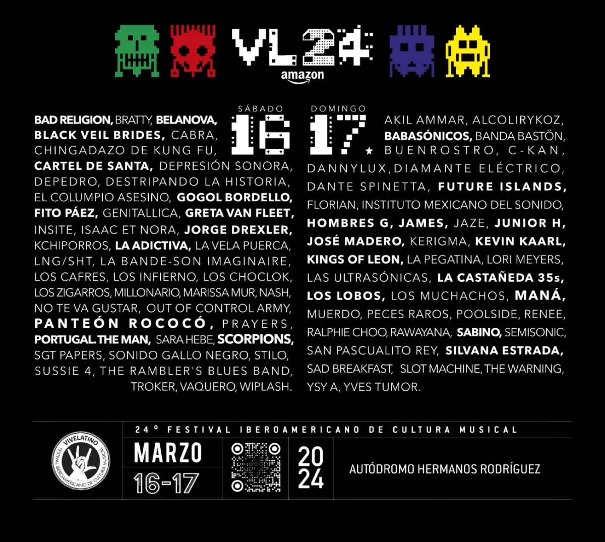 El festival Vive Latino 2024 presentado por Amazon se celebrarรก el sรกbado 16 y domingo 17 de marzo de 2024 en el Autรณdromo Hermanos Rodrรญguez de la Ciudad de Mรฉxico, con la participaciรณn de mรกs de 50 artistas nacionales e internacionales de diversos gรฉneros musicales, como rock, reggae, trap y regional mexicano.