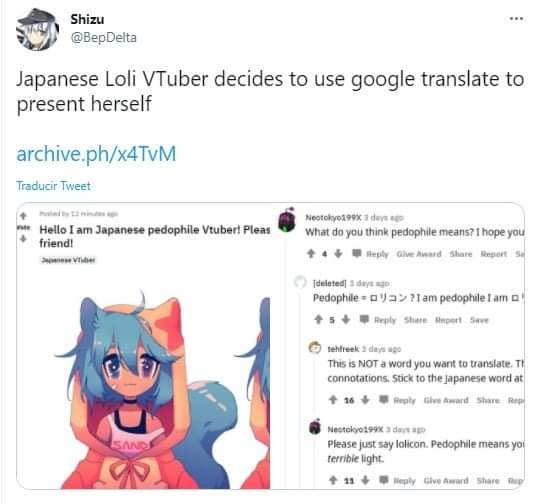 Una publicaciรณn en reddit tomรณ por sorpresa a algunos usuarios y es que al parecer una loli Vtuber japonesa utilizo un traductor para presentarse ante la comunidad inglesa pero este le jugรณ una mala pasada y tradujo ยซLoliconยป como ยซPedof**aยป.