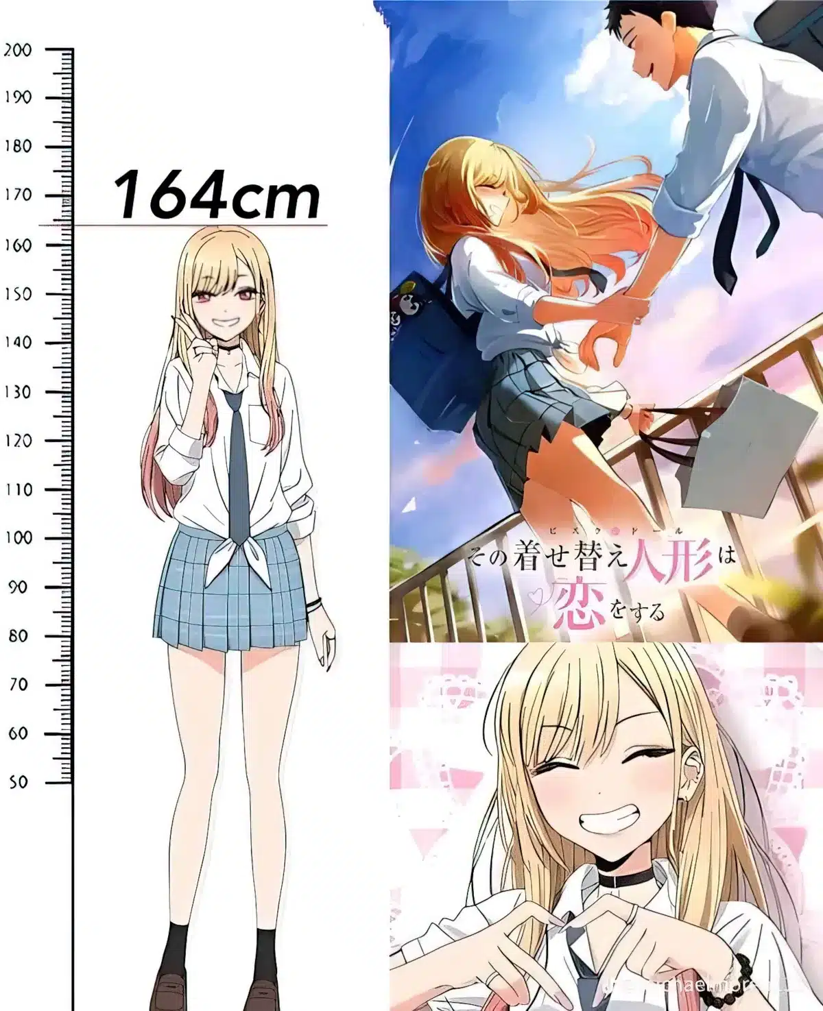 Y ya yendo a una altura un poco mรกs alta de lo normal esta Marin Kitagawa de Sono Bisque Doll wa Koi wo Suru, la cual para ella el lograr tener la estatura que tiene es un factor muy importante en su pasiรณn, ya que para realizar muchos de los cosplays que hizo en la historia necesita medir un poco mรกs de lo usual, pero su altura es de 164 cm, por lo que para muchas personas puede ser una altura un poco alta, pero para otros puede ser normal.