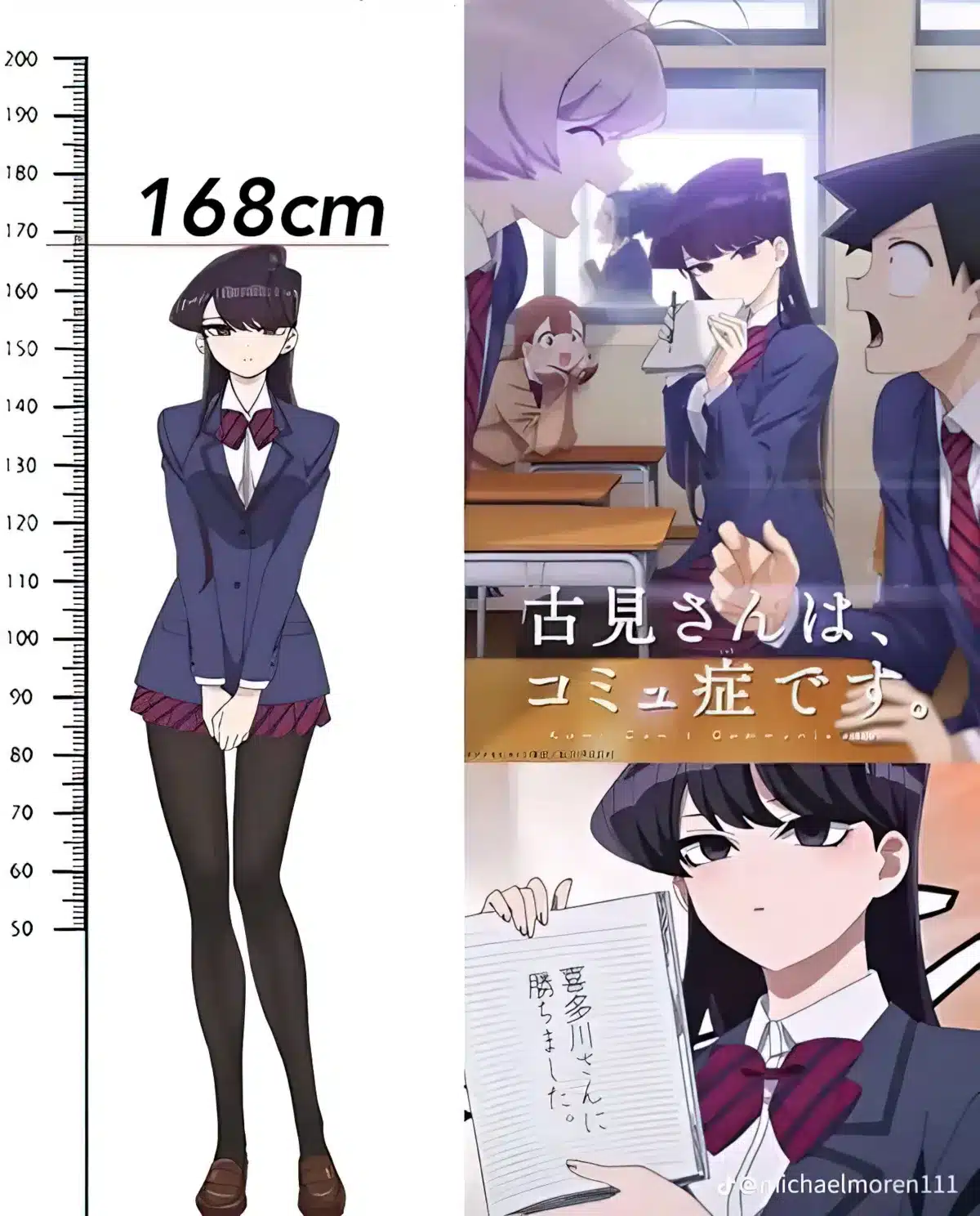 Otra de las waifus favoritas de los romcoms es Shoko Komi de Komi-san Can’t Communicate, la cual logro cautivar a miles de fanรกticos por su particular personalidad y expresiones que manejaba en la serie. Un factor importante de ella que se logra ver a simple vista en la serie es su sorprendente altura la cual logra medir 168 cm, lo que supera por mucho el estรกndar de altura de las chicas en Japรณn e incluso se podrรญa decir que de otras partes del mundo, pero no es la chica mรกs alta que podamos encontrar en la actualidad en los romcoms.