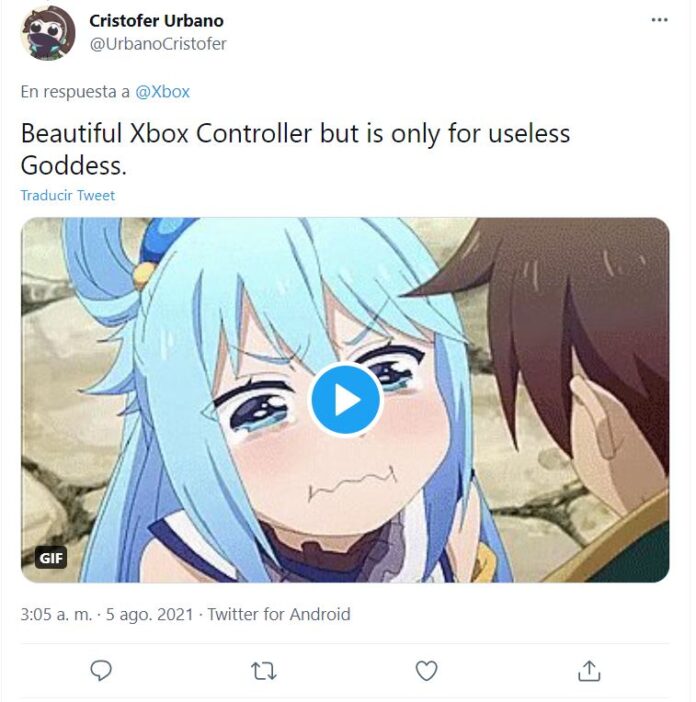 Sorpresivamente, la cuenta oficial de Xbox reaccionó a uno de los comentarios que hacían referencia a Konosuba y comentó lo siguiente: «Un control inútil para una diosa inútil».