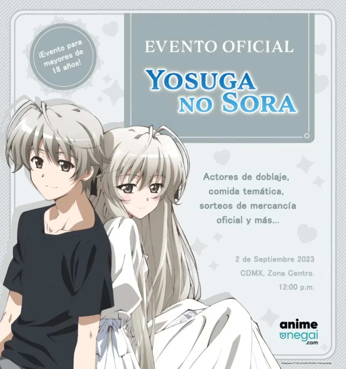 ¡Estamos muy emocionados de compartirles una noticia increíble sobre el próximo evento oficial de Yosuga no Sora traído a todos nosotros por Anime Onegai, quienes están preparando un evento que no querrán perderse! El evento oficial de Yosuga no Sora se llevará a cabo el próximo 2 de septiembre a las 12:00 pm en Ciudad de México, Zona Centro. Tendremos la participación de talentosos actores de doblaje, comida temática, sorteos de mercancía oficial y muchas sorpresas más que se han preparado para ustedes.