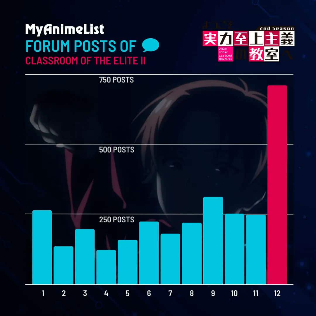 Todo esto se ve comprobado gracias a un reporte que el popular portal ยซMyAnimeListยป ha realizado en sus redes sociales, y es que la cantidad de publicaciones que se han creado en el foro dedicado a la segunda temporada del anime Youkoso Jitsuryoku Shijou Shugi no Kyoushitsu eย ย desde que se emitiรณ su episodio 12, ha ido incrementando de manera considerable, y a pesar de que este capรญtulo fue transmitido hace ya algunos dรญas, las personas no paran de seguir hablando sobre este episodio, una muestra que han quedado muy satisfechos y emocionados por lo que se viene prรณximamente.