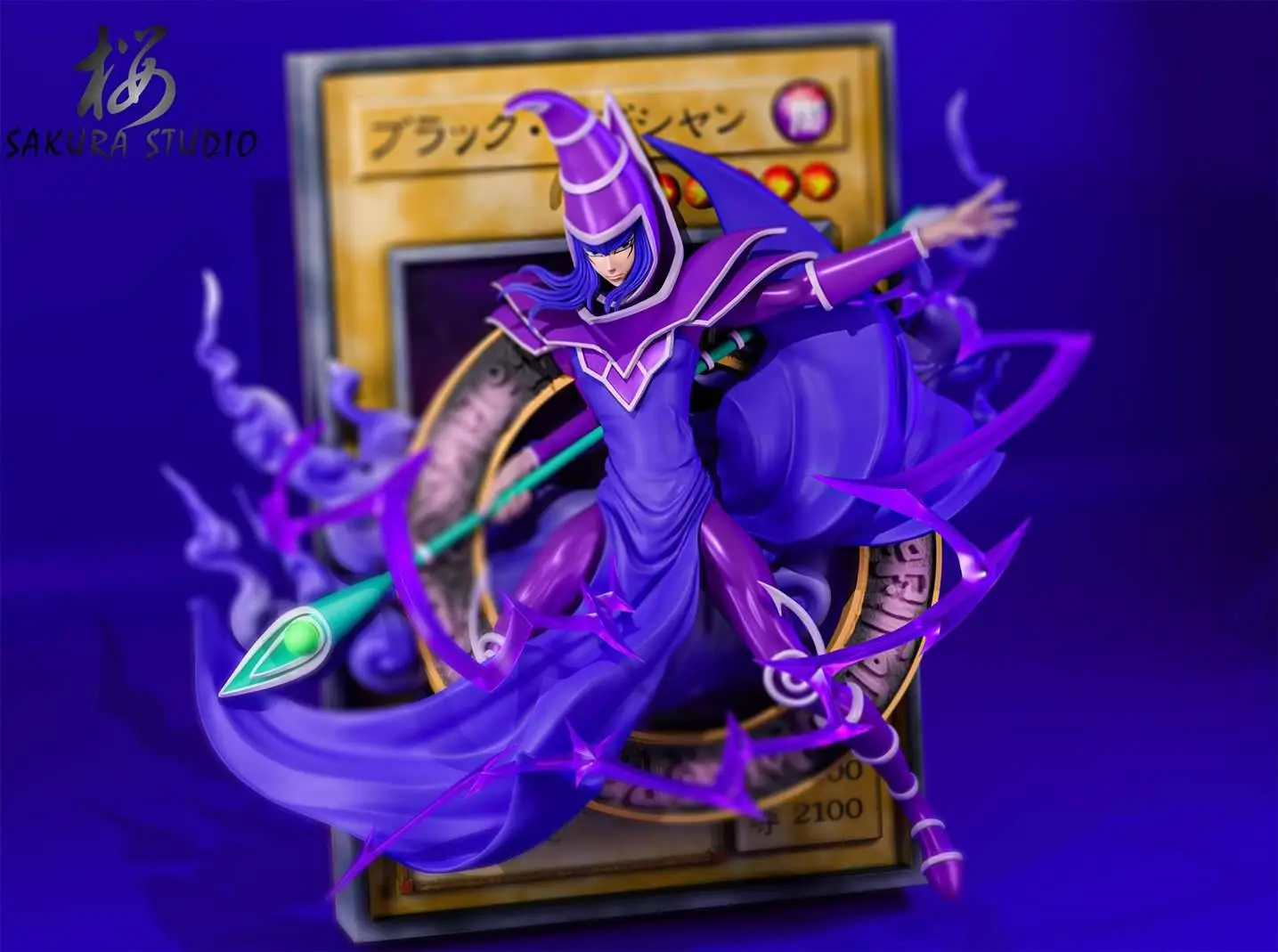 Por otro lado, se encuentra una icónica waifu de Yu-Gi-Oh, la chica maga oscura, tan hermosa como poderosa. Al igual que su maestro, cruza el círculo mágico de su carta, aparece volando envuelta en movimiento y llegando con toda su energía para hacer pedazos a cualquiera en el duelo. Con su mano izquierda sobre su sombrero en señal de apoyo y su mano derecha sobre su báculo azul con dorado.