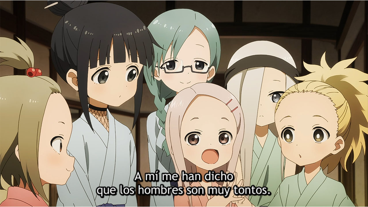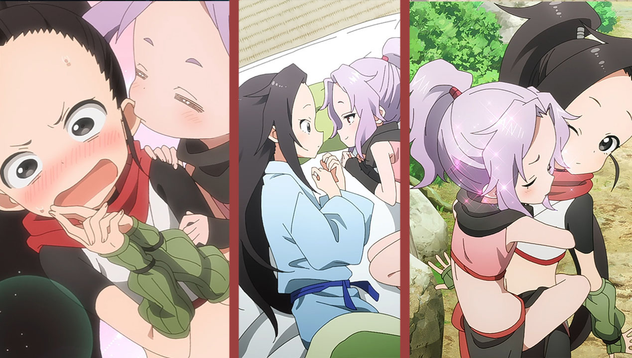 Asรญ mismo, al tratarse de una aldea de chicas, el afecto entre ellas no pasa desapercibido en este primer episodio. aunque no podrรญa catalogarlo como Yuri, ya que se presenta en una forma muy inocente y de hermandad caracterizado en la relaciรณn afectuosa de Sanzaka hacia Tsubaki.