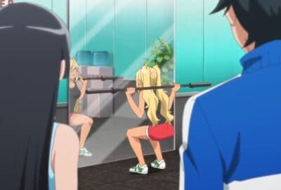 Nos encontramos a Hibiki llegando al gimnasio y ya tenemos a Akemi haciendo sentadillas con barra. Proseguimos con la explicación erótica usando de modelo a Akemi y así es como vas a morir, Hibiki, te toca. Le dice a Hibiki que empiece haciendo sentadillas sin barra frente al espejo para ver su rendimiento, a lo que Hibiki piensa que será pan comido. «Agacharse sin ningún peso es como una brisa», y casi se muere antes de llegar a 10. Ya con la risita tonta viendo a Hibiki por los suelos, Akemi aprovecha para sacar otra referencia, esta vez sobre los piernas de pollo (pata pollo).