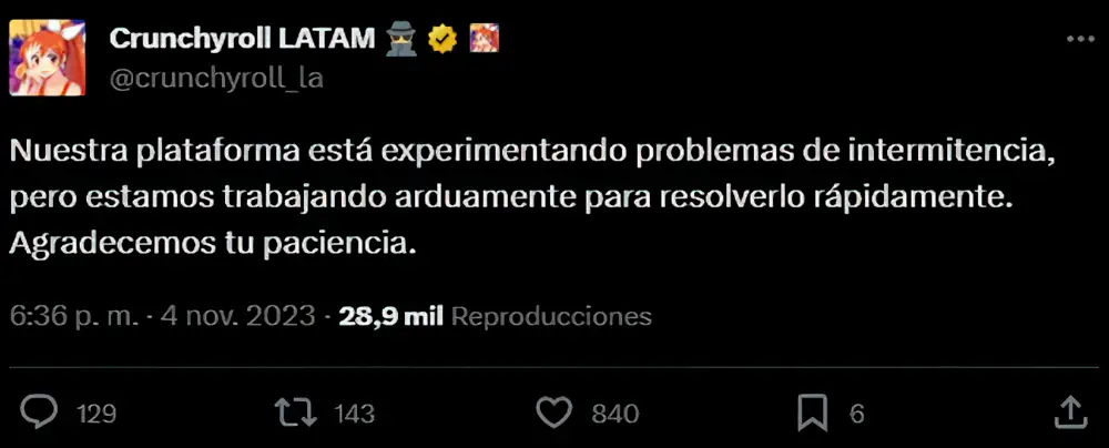 En el Tweet mencionan lo siguiente: «Nuestra plataforma está experimentando problemas de intermitencia, pero estamos trabajando arduamente para resolverlo rápidamente. Agradecemos tu paciencia.» Esto se dio a conocer después de que tras varios minutos usuarios reportaran fallas en la plataforma debido al gran número de personas que intentan ver el último capítulo del anime, a lo cual a pesar de que talvez Crunchyroll anticipara esto, al final de cuentas fueron superados por le entusiasmo de los fanáticos.