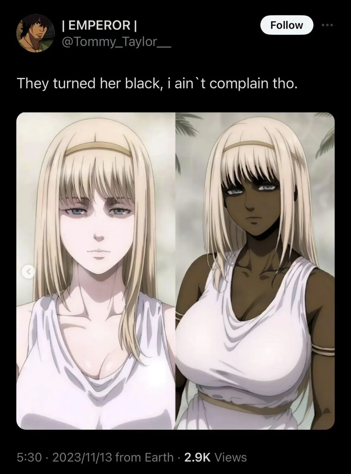 Resulta ser que en la plataforma X antes llamada Twitter, el usuario «@Tommy_Taylor__» compartió una ilustración donde se muestra a la fundadora del poder titánico en «Attack on Titan», «Ymir Fritz» con un cambio en su tono de piel, pasando de blanca como la vimos en la serie a una piel de color negra, una situación que a primera vista y sin contexto es algo desconcertante en sí, pero más aún con se trata de una publicación para dar a conocer que existe poca representación de personas de color en el anime. Esto inmediatamente genero una discusión debido a un pequeño detalle en el trasfondo de Ymir como personaje.