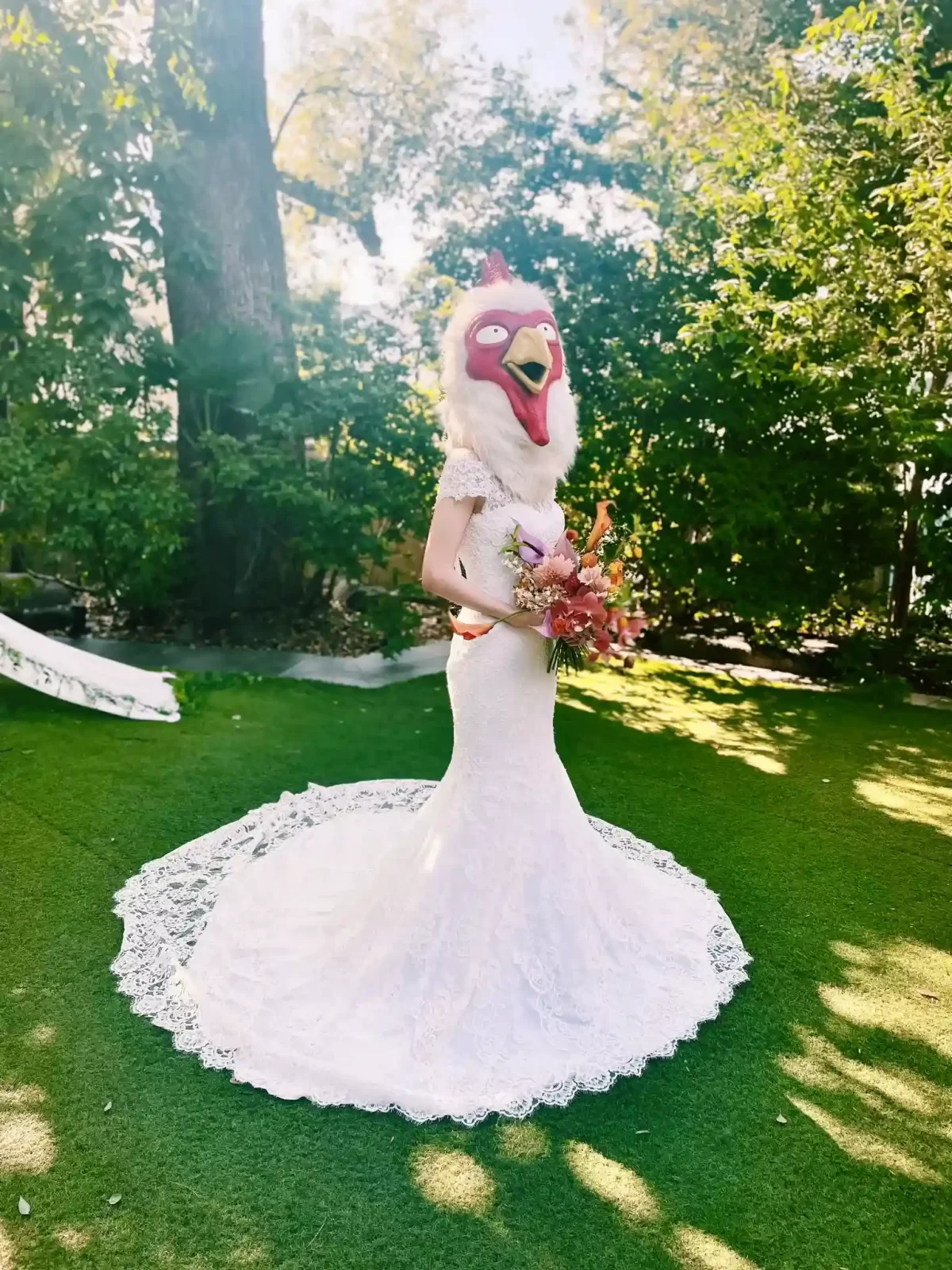 En la imagen podemos ver como el escenario que eligió encaja perfectamente con el ambiente que quería la autora para su boda, se puede observar que donde se tomó las fotografías fue un lugar muy tranquilo, lleno de naturaleza, la novia luciendo un lindo vestido blanco de novia y dándole su propio toque personal, su característica cabeza de gallina por la cual la conocen muchos de sus fanáticos, sin duda una imagen que para cualquier desconocido le resultaría extraña, pero para los que ya conocen a la autora simplemente da una felicidad por ver que se encuentra viviendo uno de los momentos más felices de su vida.