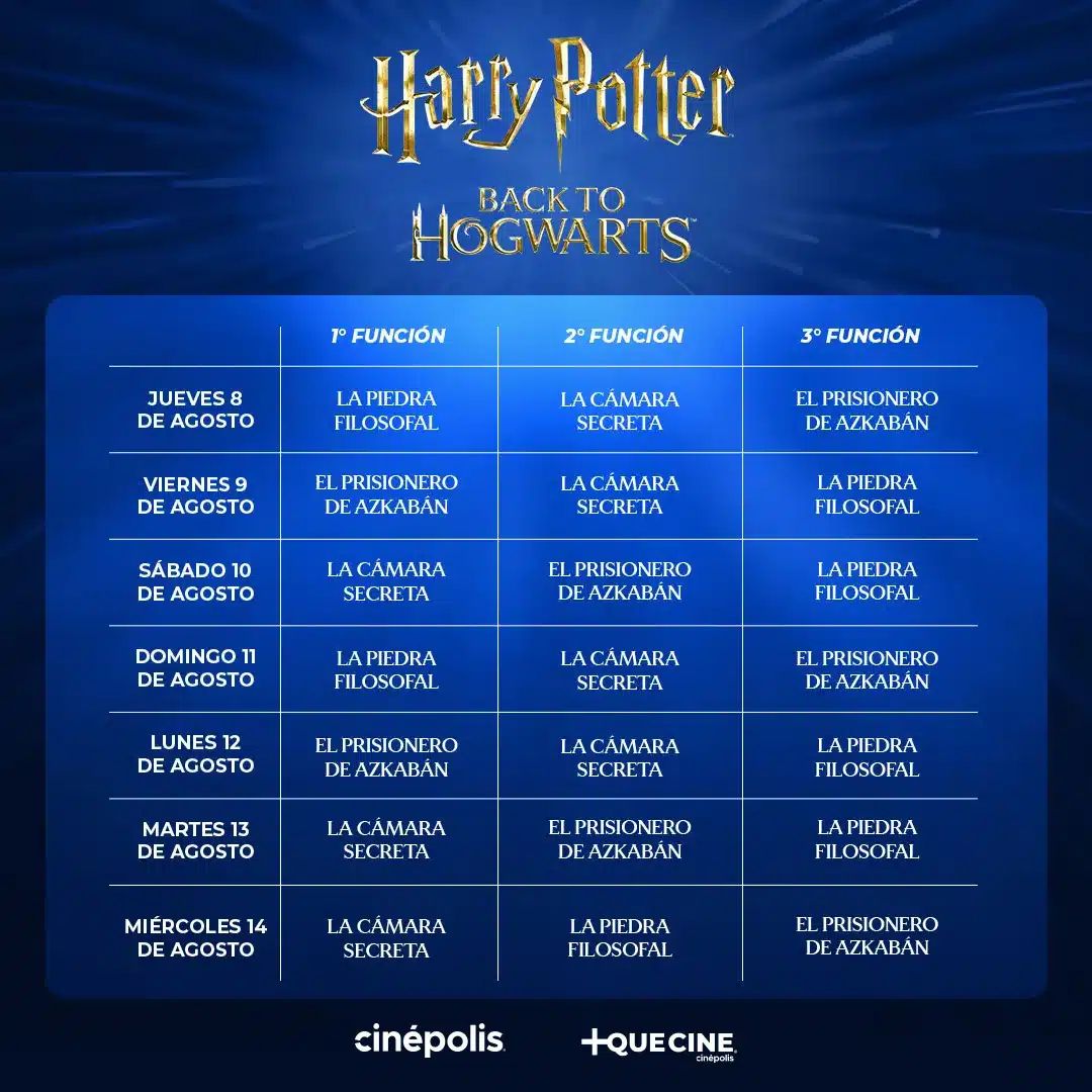 Del 8 al 14 de agosto, el evento «Back to Hogwarts» ofrecerá tres proyecciones diarias de las películas de Harry Potter, iniciando con «La Piedra Filosofal«, seguida por «La Cámara de los Secretos» y culminando con una proyección especial por el 20 aniversario de «El Prisionero de Azkaban«, una de las entregas más queridas y emblemáticas de la saga.