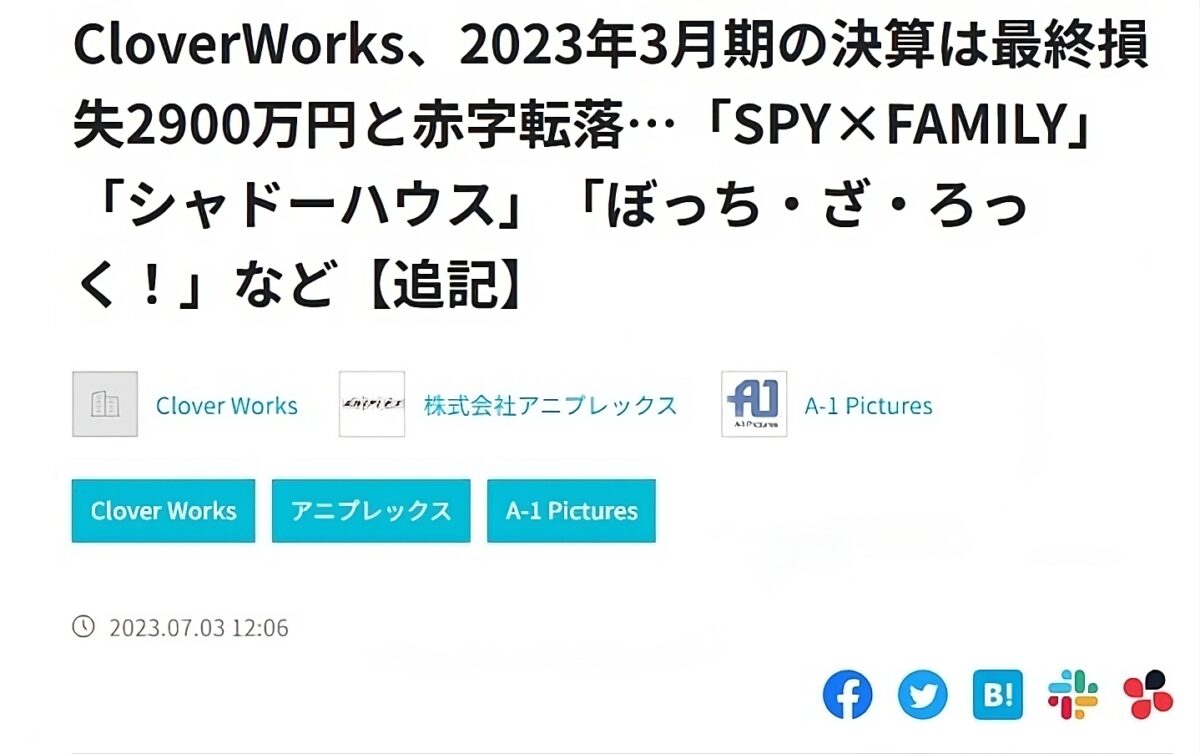 En popular foro japonés Yaraon!, se dio a conocer un pequeño extracto de uno de los reportes fiscales por parte de CloverWorks en el año 2023, donde se mostró que el estudio reporto unas pérdidas de 29 millones de yenes, situación que inmediatamente alarmó los otakus en el mismo foro, ya no podían creer que esta situación estuviera sucediendo a tan exitoso estudio y donde rápidamente soltaron comentarios con los que podrían ser algunos de los responsables de este terrible acontecimiento.