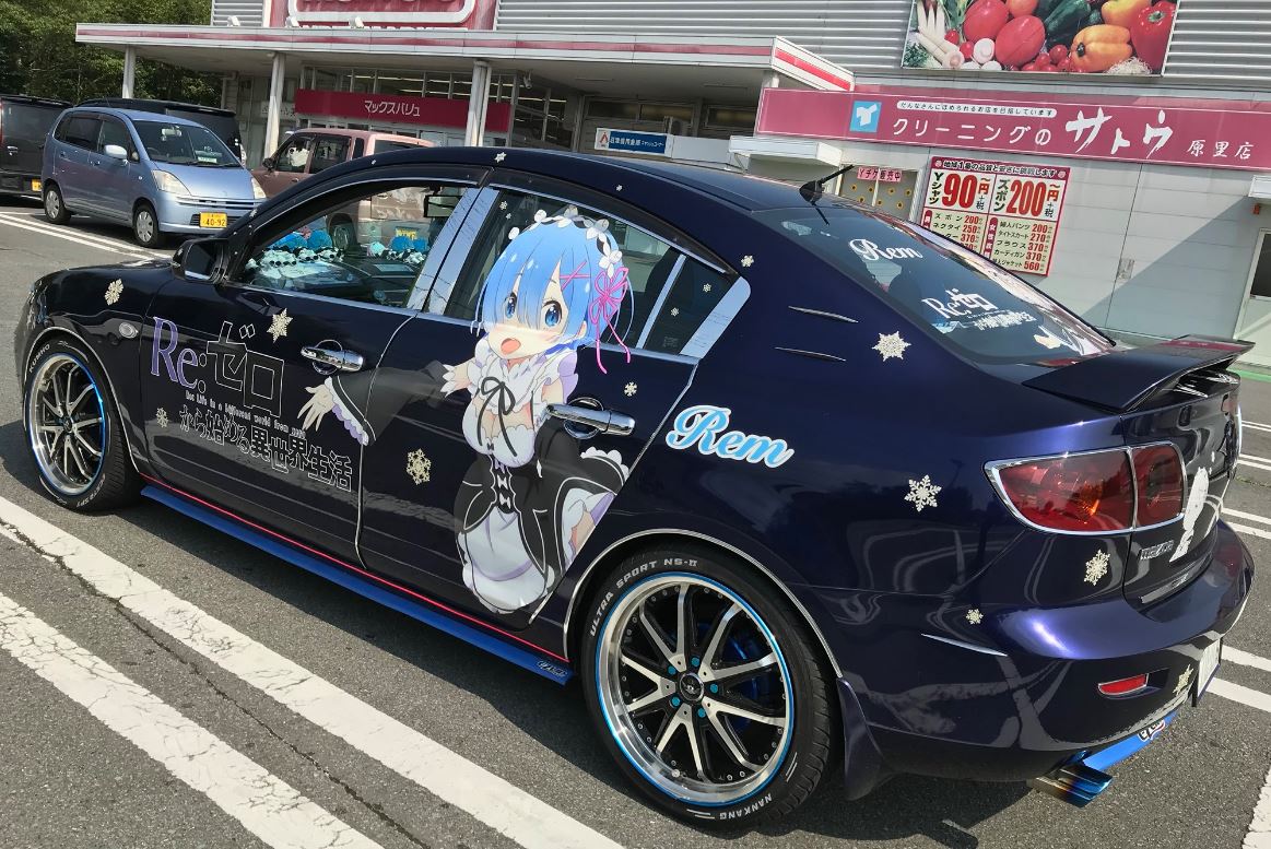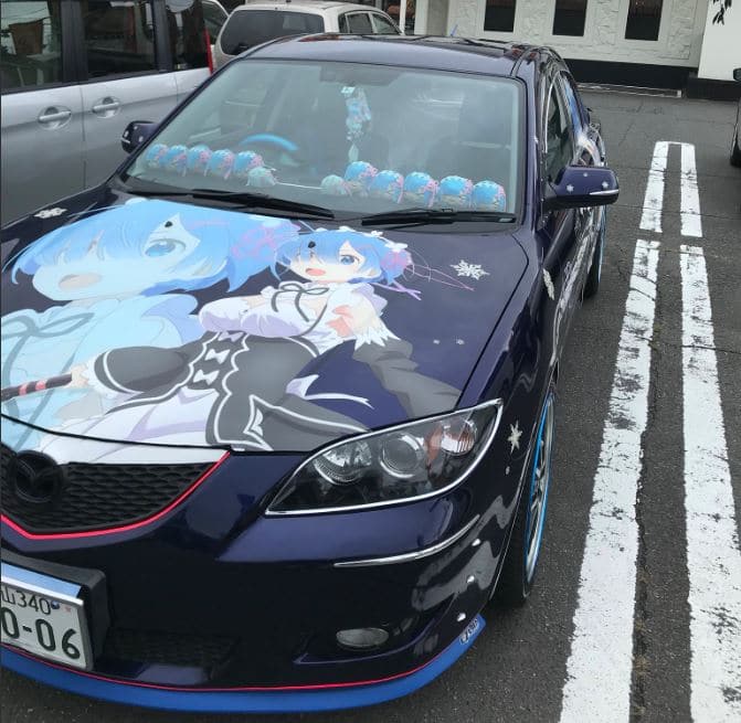 Y se creías que esto era todo aun falta algo más por ver, su coche de color azul como el pelo de Rem también está tapizado de la waifu.