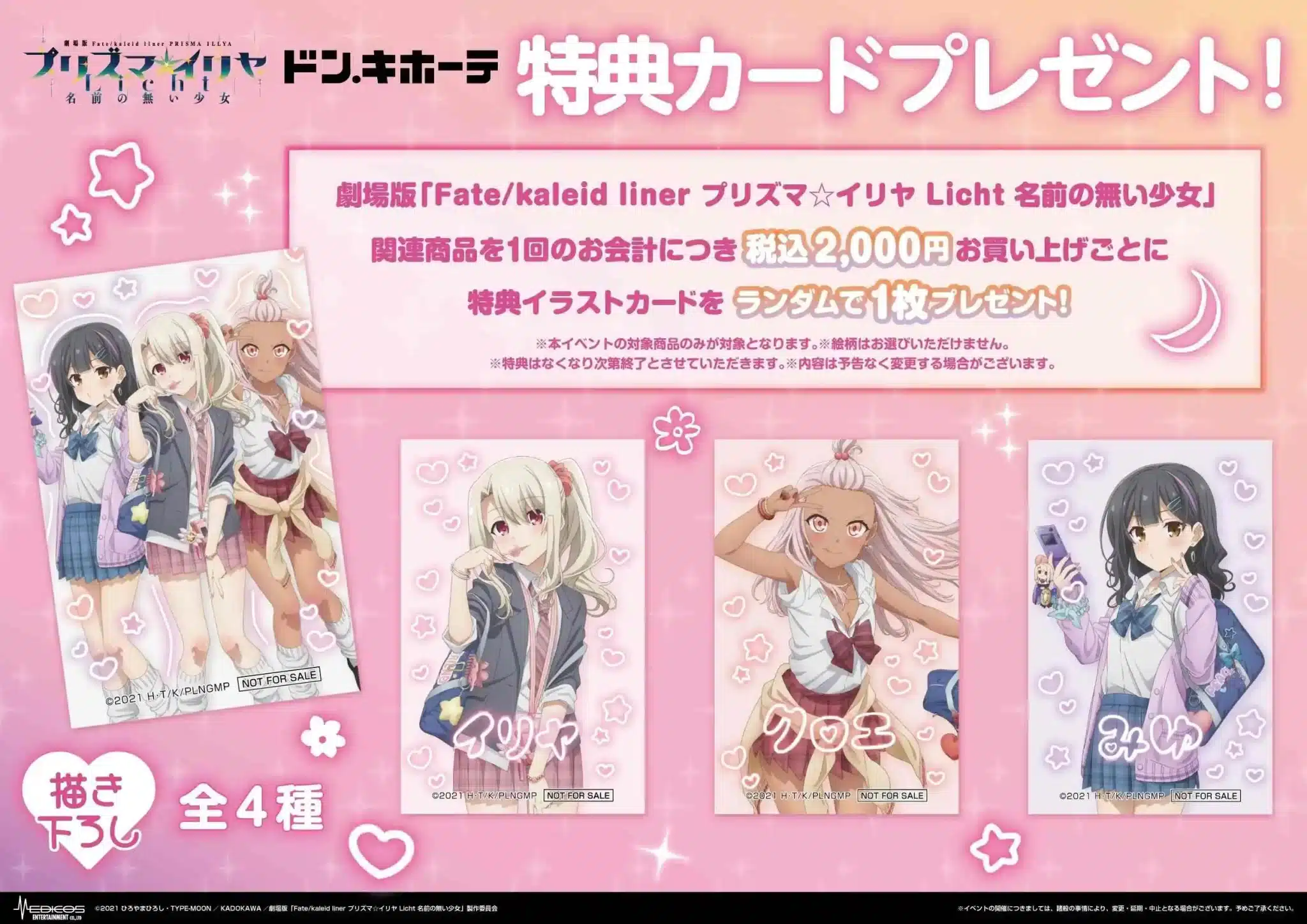 Adicionalmente, se agrega una increíble recompensa, pues por cada compra de 2000 yenes de compra de productos de la colaboración Fate Kaleid, es decir, unos 13.74 dólares aproximadamente, los fanáticos recibirán como bonificación una de las 4 tarjetas ilustrativas, sin olvidar que al igual que los demás productos, se encuentran sujetos a disponibilidad.