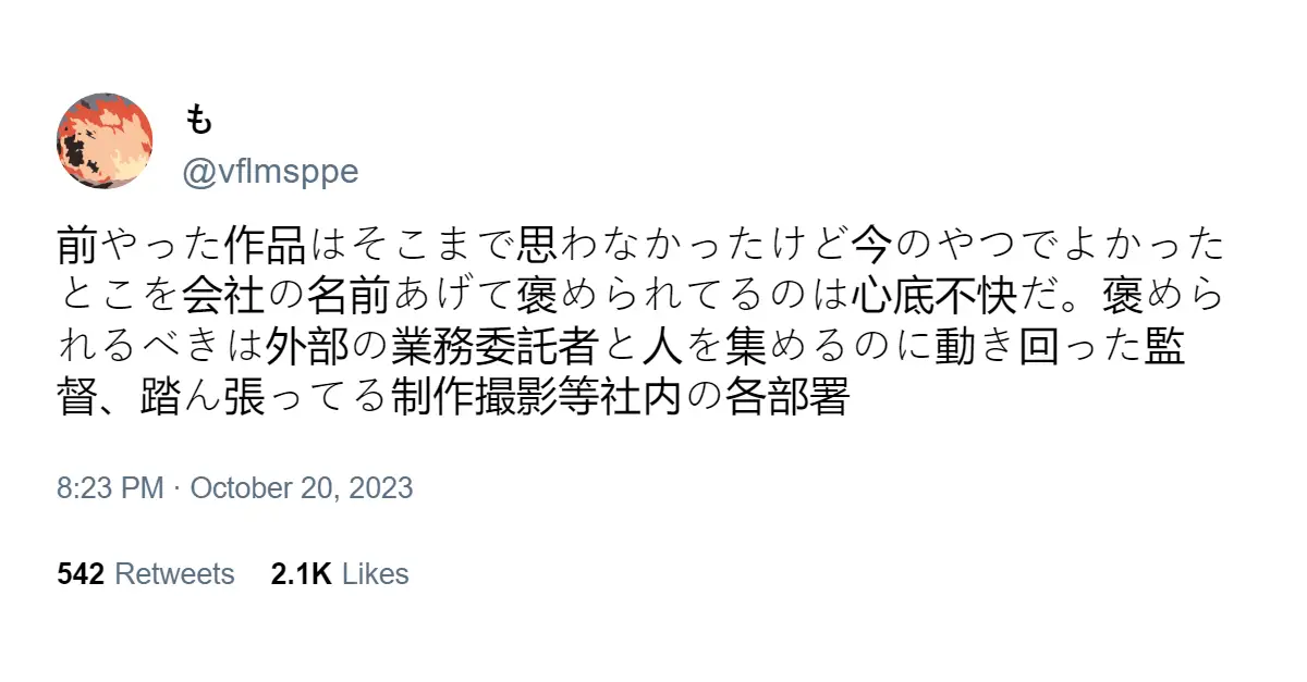 Itsuki Tsuchigami publico lo siguiente en Twitter: ยซNo pense mucho en el trabajo que hice antes, pero me alegro de haber hecho el trabajo que hice ahora. Es realmente desagradable escuchar a la gente elogiar a la empresa mencionandola por su nombre. Entre los que deben ser elogiados se encuentra el director que se movio para reunir a contratistas y personas externas para trabajar, y los distintos departamentos dentro de la empresa, incluidos el de produccion y filmacion.ยป