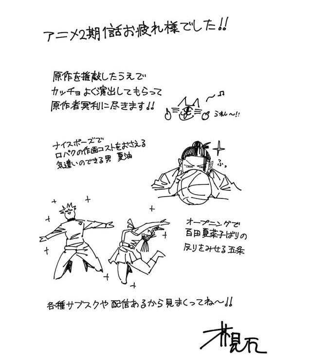 El autor del manga expresรณ solo elogios hacia el nuevo director del anime, Shลta Goshozono. Algunos seguidores estaban un tanto inquietos debido a que Park Sung-hoo, quien dirigiรณ la primera temporada y la pelรญcula, dejรณ MAPPA para establecer su propio estudio. Sin embargo, Akutami tuvo plena confianza en su sucesor y resultรณ ser incluso mejor que la primera temporada hasta el momento.