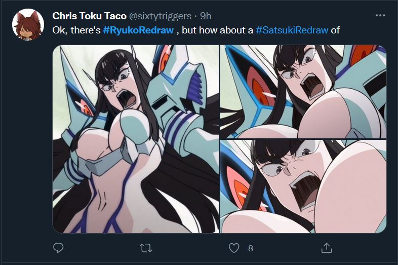 Una publicación en Twitter hecha por el usuario (@KLKWhispers) se hizo viral en los últimos días, ya que en este tuit pidió a los demás artistas redibujar con sus propios estilos una icónica escena del anime Kill la Kill donde Ryuko se desviste. A lo cual muchos usuarios de Twitter compartieron sus dibujos con el hashtag #RyukoRedraw, asimismo, a este desafío se unieron otros artistas del sitio web Newgrounds.