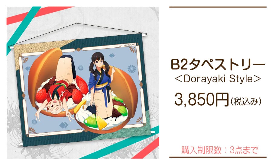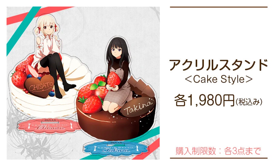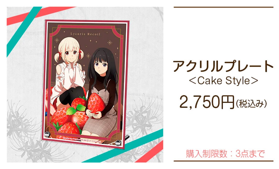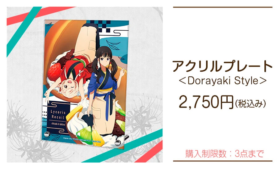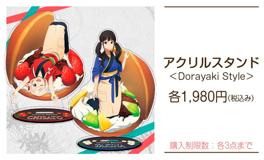 Queda seรฑalar que el evento colaborativo entre el anime Lycoris Recoil y la compaรฑia Anime University COOP comenzarรก el 3 hasta el prรณximo 18 de diciembre de este aรฑo, y para aquellas personas que asistan a dicho evento podrรกn adquirir algunos productos especiales que estarรกn basados en el duo Chisato y Takina. Algunos de los productos que estarรกn disponibles en este evento serรกn los habituales ยซPapel Tapiz B2ยป, ยซFiguras de Acrรญlicoยป, ยซPanel de Acrรญlicoยป, entre otro tipo de productos que contarรก con 2 versiones, ยซCake Styleยป y ยซDorayaki Styleยซ.