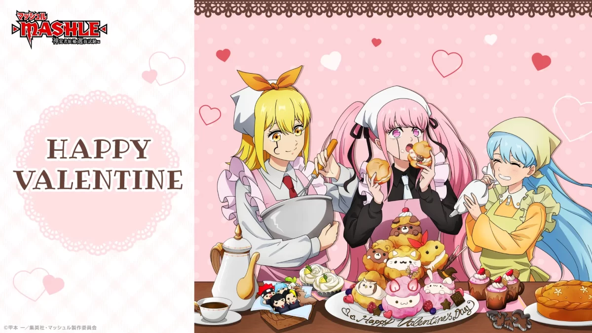 La visual de San Valentín que se presentó en los medios oficiales de la serie de anime «Mashle: Magic and Muscle» tiene como protagonistas a los personajes Lemon Irvine, Love Cute y Anna Crown, en donde podremos ver a las waifus de la serie preparar unos apetitosos pastelitos para celebrar esta fecha especial.