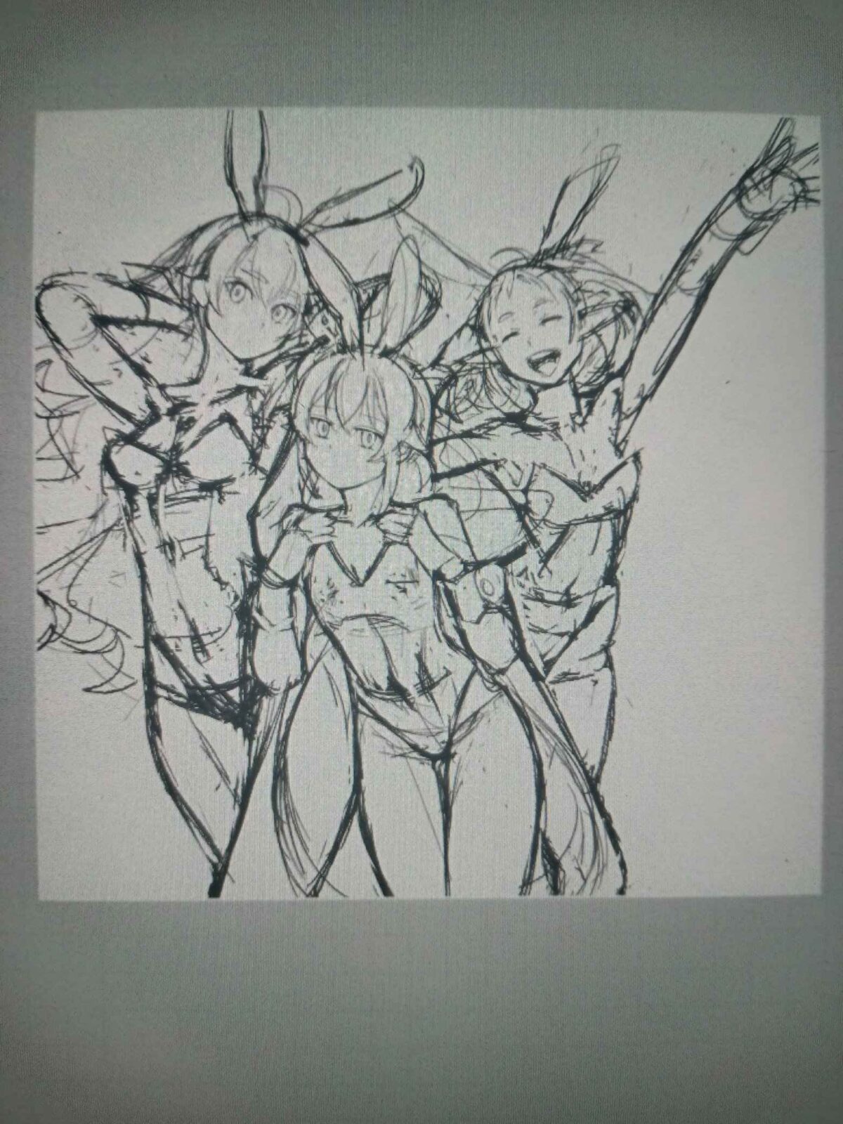 Ademรกs del resultado final de su creaciรณn, Kiyo compartiรณ un par de fotografรญas que muestran el proceso artรญstico detrรกs de esta ilustraciรณn. En estas fotos, podemos ver el viaje desde un boceto inicial sucio de la imagen, donde las lรญneas estรกn dibujadas de forma ruda y sin una orientaciรณn firme. A medida que avanzamos en el proceso, vemos cรณmo el dibujo se va refinando, con detalles cada vez mรกs nรญtidos y precisos en cada una de las chicas de Mushoku Tensei.