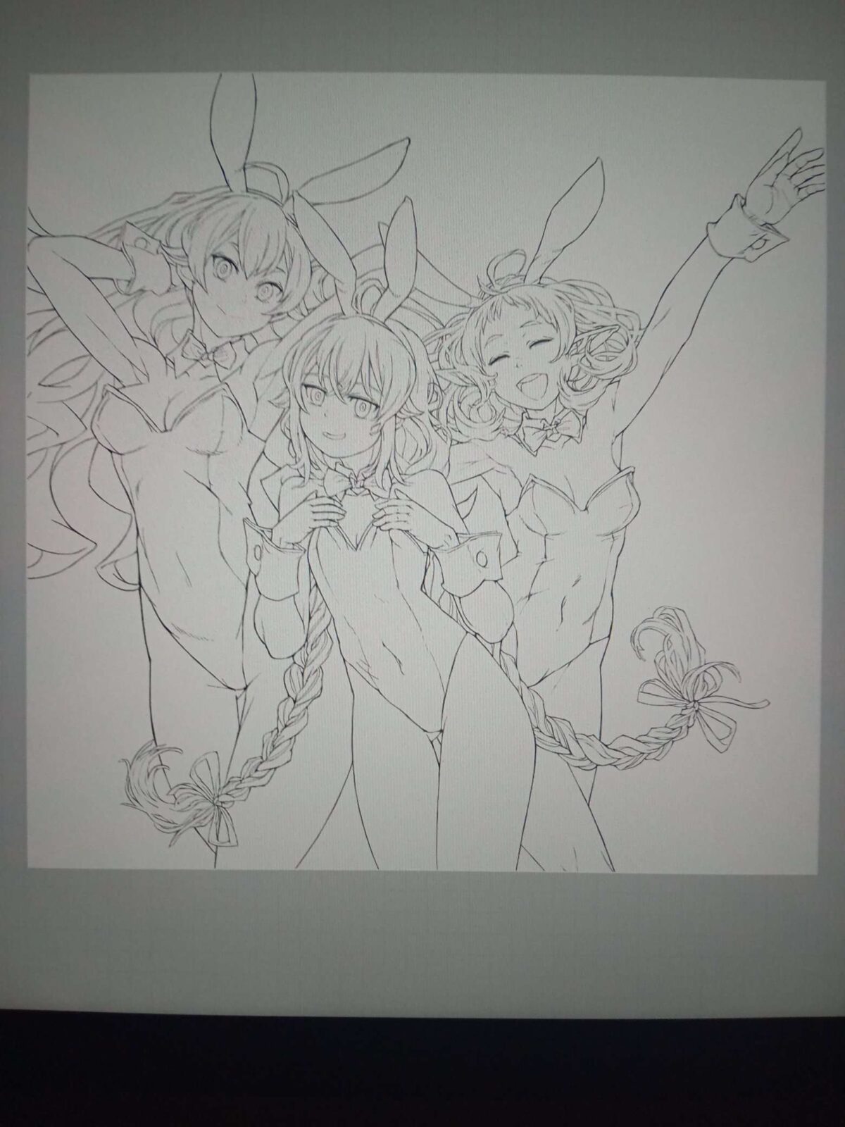 Finalmente, Kiyo nos muestra una imagen en el proceso de coloreo. Los colores en esta etapa se muestran secos y sin vida, lo que es tรญpico en este tipo de imรกgenes antes de definir con sombras y otras capas de colores. Este vistazo al proceso creativo detrรกs de la ilustraciรณn nos permite apreciar el talento y la dedicaciรณn que Kiyo puso en su trabajo para traer a estas queridas chicas de Mushoku Tensei a la vida de una manera tan hermosa y cautivadora.