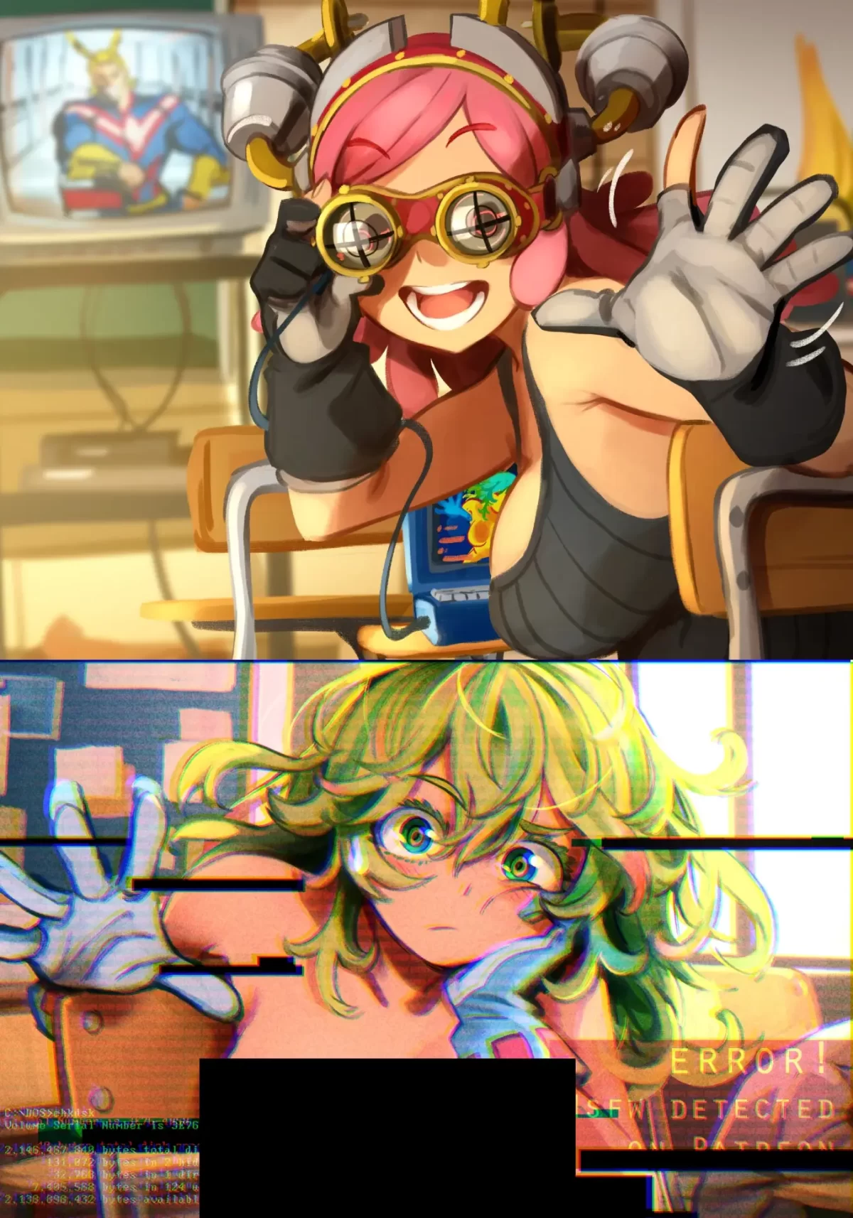 Y ahora en cuanto a los detalles que Khyle oculto en la ilustración, se puede suponer que los dos personajes se encuentran en detención y esta escena nos recuerda a cierta película de Marvel en donde se le puede ver al capitán América en un video mientras varios están en un aula de detención, lo mismo en esta escena, pero All Might hablando mediante un video a los estudiantes, también otro dato que encontramos es que en el código que se observa en la esquina inferior izquierda recuerda mucho al código original de Windows y por último muchos se dieron cuenta de que en esta ocasión invisible girl no se encuentra utilizando uniforme, a comparación con My hero Academia.