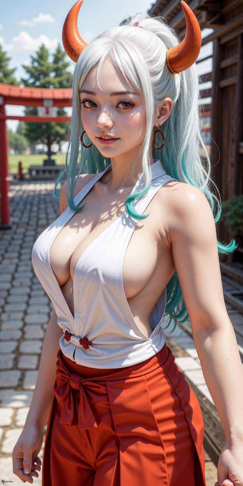 Las ilustraciones generadas por inteligencia artificial resaltan maravillosamente la esbelta figura y el singular encanto femenino de Yamato del anime One Piece. En cada una de ellas, Yamato viste la característica vestimenta que luce a lo largo del anime, compuesta por una blusa sin mangas y una falda roja que rememoran el estilo tradicional japonés.