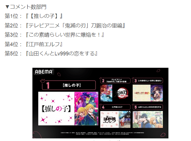 El popular portal de noticias Oricon News, compartió un artículo en donde se informa que ABEMA ha anunciado la clasificación final de datos de visualización de la transmisión de anime en abril de este año. En dicha clasificación resultó sorprendente que el anime Oshi no Ko se hizo con el primer lugar, siendo el anime con mayor número de espectadores de primavera 2023.