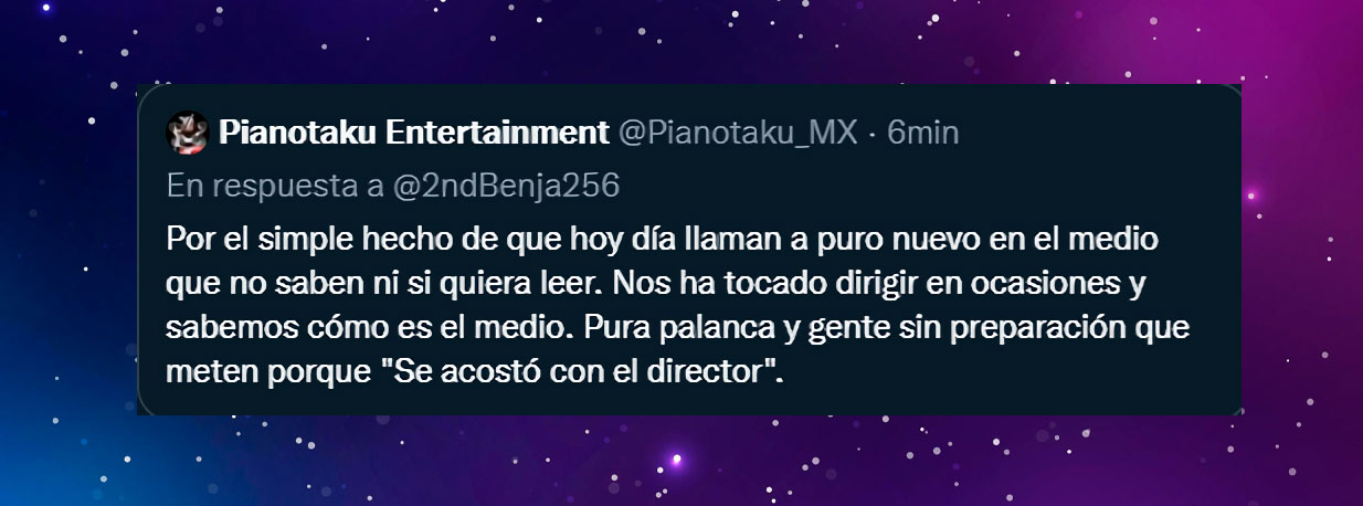 Además, el grupo Pianotaku Entertainment también ha dejado algunos comentarios en su Twitter oficial, y tal como hemos mencionado anteriormente, hace enfoque a la industria del doblaje y como ciertas personas consiguen un puesto por «acostarse con el director».