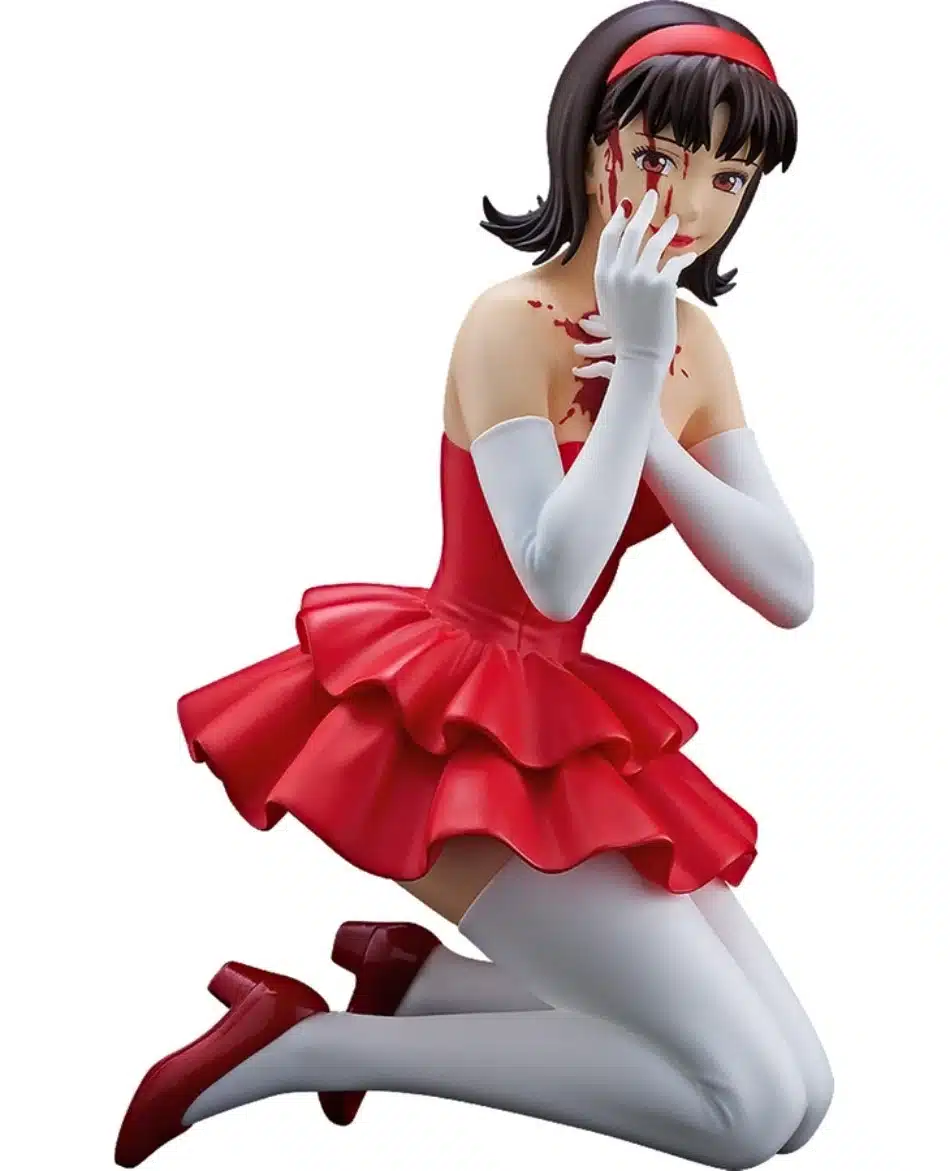 Se trata de una figura de Mima Kirigoe de Perfect Blue, la cual oscila entre los 17 y 18 cm de altura aproximadamente, en donde podemos observarla posando hincada apoyada de sus rodillas sobre lo que parece un escenario, vistiendo su icónico atuendo conformado de un vestido tipo corsé, corto con holanes y sin tirantes color rojo, acompañado de calcetas y guantes largos blancos, zapatos brillantes y diadema rojos.