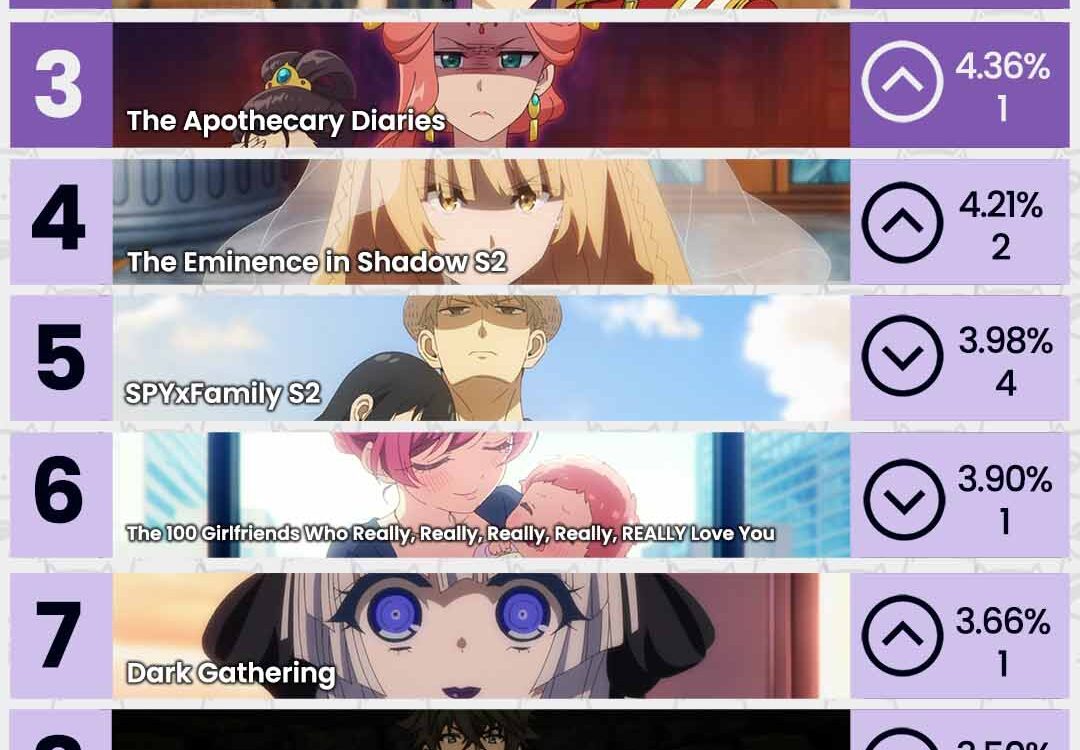 Los animes Jujutsu Kaisen S2, Frieren: Beyond Journey’s End y The Apothecary Diaries se ubican en el podio esta semana.