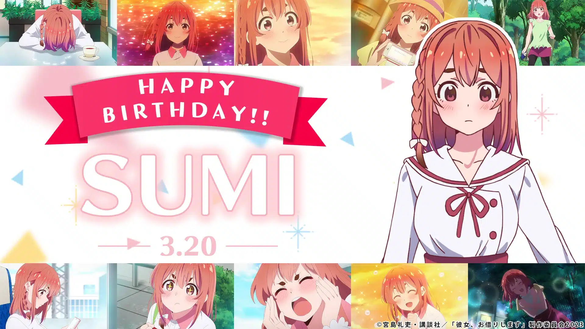 Esta celebración se realizó en los medios oficiales para la adaptación al anime del manga «Rent-a-Girlfriend«, lugar donde se presentó al público una imagen conmemorativa por la llegada del cumpleaños de la encantadora Sumi Sakurasawa. Con un letrero grande que dice ¡Feliz Cumpleaños Sumi! Junto a la fecha «20 de Marzo», esta imagen temática ha reunido a todos los fanáticos de esta tímida, pero hermosa waifu y juntos le han dedicado un feliz cumpleaños a Sumi.