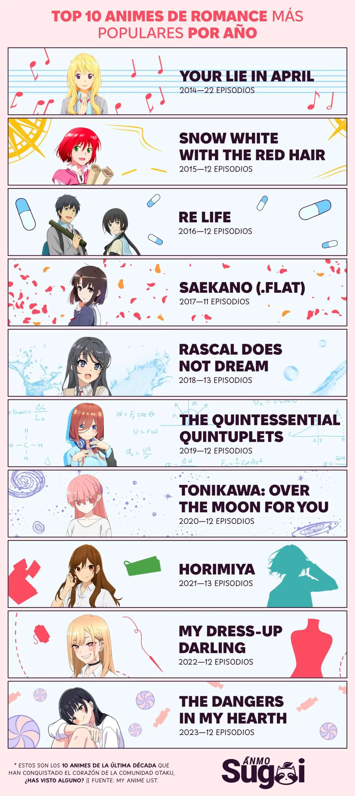 «San Valentín» es una fecha muy importante para todos los fans, no solo del anime, sino que también para todo el público en general, pues es una festividad que nos invita a compartir y celebrar con nuestra pareja o amigos. Para aquellos otakus que gustan más de pasar este día viendo un maratón de sus animes de romance favoritos, hoy, el equipo de ANMO SUGOI ha preparado una infografía con los animes mejor valorados, los favoritos de los fans y lo mejor de lo mejor en esta categoría de los últimos 10 años según la plataforma «MyAnimeList»