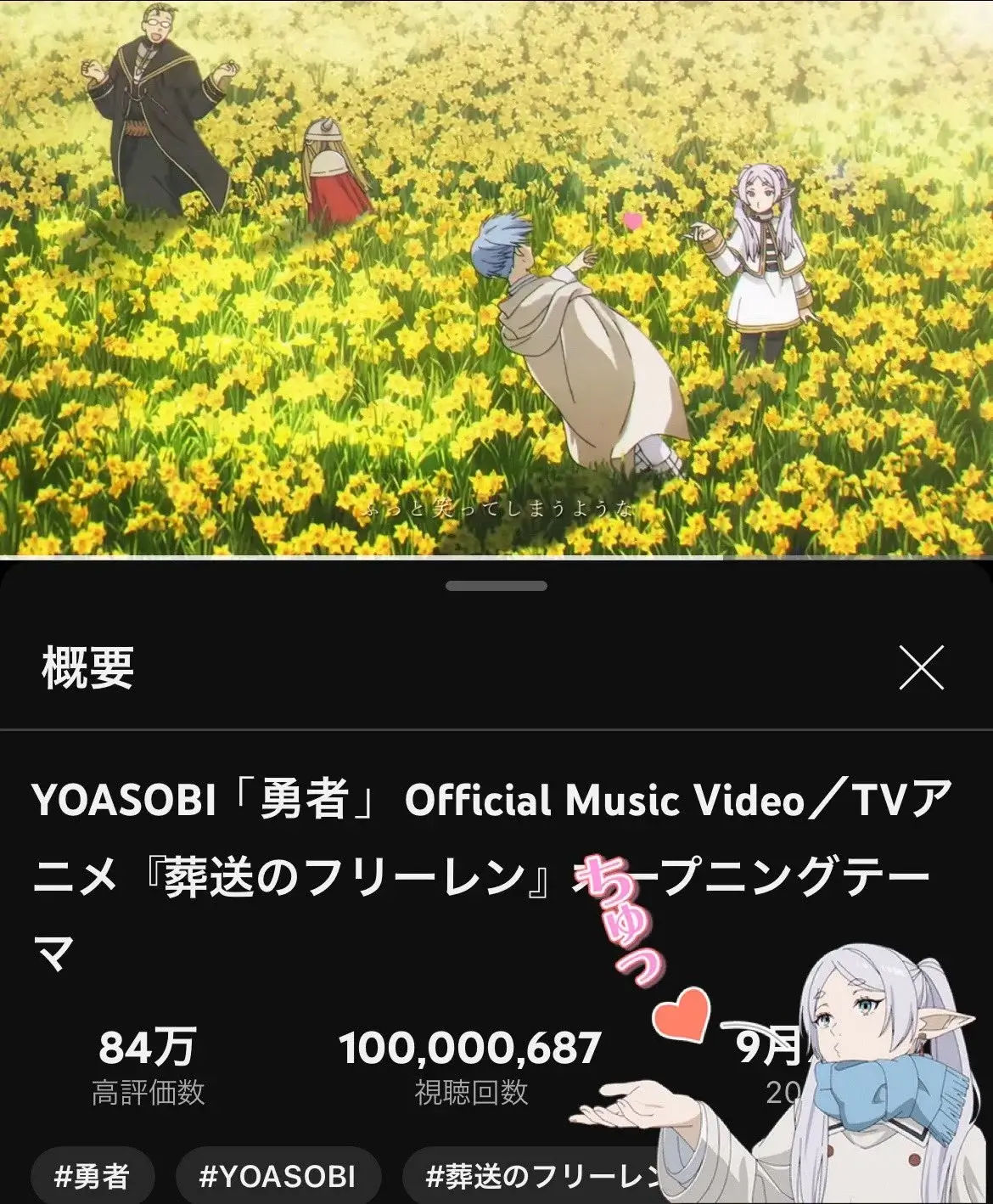 Mediante la cuenta oficial del manga de Sousou no Frieren en X/Twitter, se dio a conocer (para quienes no están al pendiente de Youtube), que el opening de dicha serie ya ha rebasado los 100 millones de vistas en la plataforma de videos. Esta destacable pieza musical está a cargo nada más y nada menos que del popular dúo japonés “YOASOBI” y lleva por nombre “Yuusha”, estrenandose un 29 de septiembre del 2023 y fue subido a la cuenta oficial de Ayase/ Yoasobi.