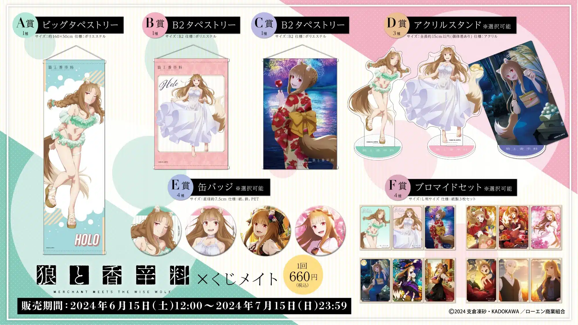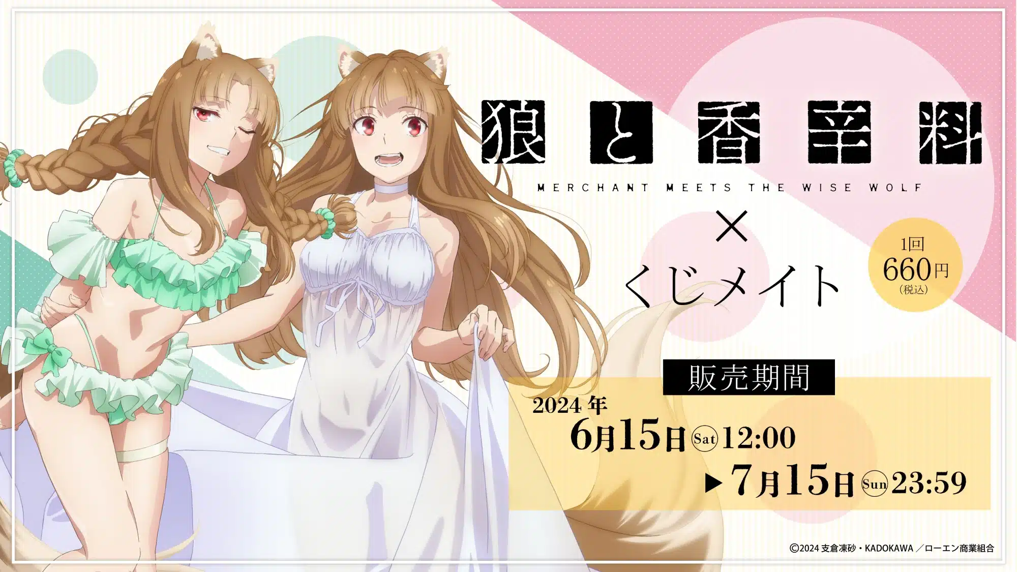 La venta de los premios se llevará a cabo a través de Kujimate, el servicio de lotería en línea de Animate, a partir del 15 de junio a las 12:00 p. m. (hora de Japón), los aficionados podrán participar en la lotería en el sitio web de Kujimate para tener la oportunidad de adquirir estos emocionantes productos de Spice and Wolf(Okami to Koushinryou). Durante el período de venta, desde el 15 de junio hasta el 15 de julio a las 11:59 p. m. (hora de Japón), los participantes podrán comprar boletos y cada uno otorgará la oportunidad de ganar alguno de los premios disponibles.