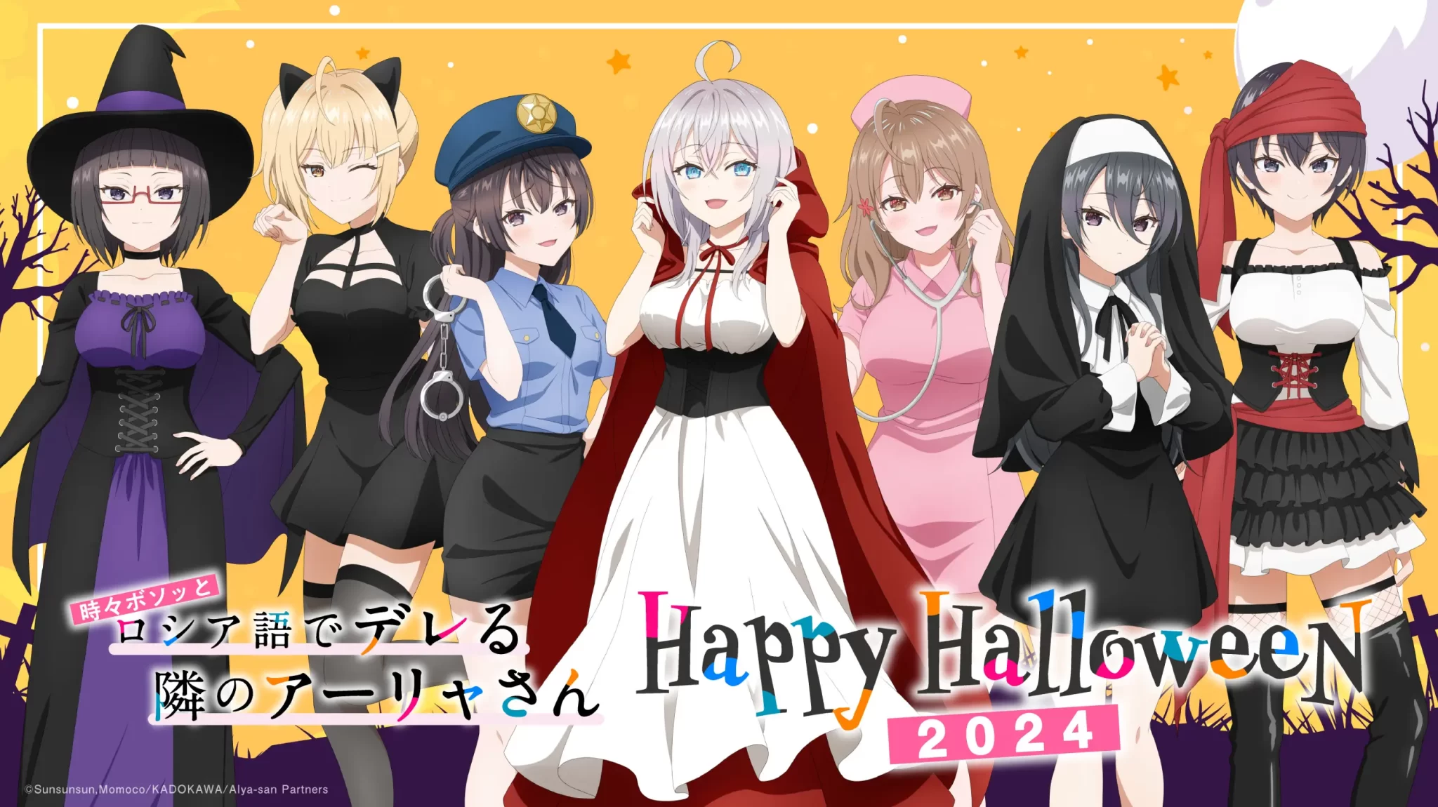 En la imagen, las chicas de Tokidoki Bosotto Russia-go de Dereru Tonari no Alya-san lucen atuendos variados, cada uno reflejando un disfraz diferente: Alisa Mikhailovna Kujou se ha convertido en Caperucita Roja, Yuki Suou en una oficial de policía, Maria Mikhailovna Kujou en una enfermera, Ayano Kimishima en una monja, Chisaki Sarashina en una pirata, Sayaka Taniyama en una bruja y Nonoa Miyamae en una chica gato.